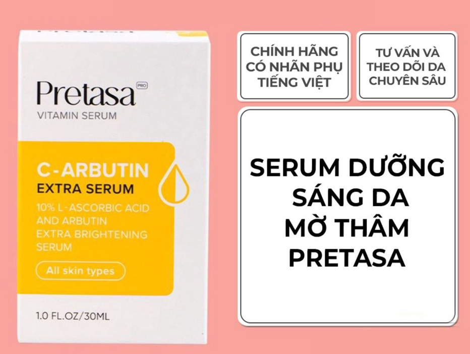 Mua tại TiktokỞ bất kì thời đại nào thì nhu cầu làm đẹp luôn được đặt lên hàng đầu, sự hiện diện của làn da trắng sáng giúp chị em luôn tươi trẻ và tự tin hơn trong cuộc sống. Nhưng do môi trường làm việc nhiều khói bụi và các sản phẩm chăm sóc da không hiệu quả nên làn da dễ bị sạm, xỉn màu và lão hóa sớm. Ngoài ra, hậu quả của các vết thâm sau mụn là những vết thâm xấu xí, khó có thể hết trong thời gian ngắn. Hơn nữa khi bước sang tuổi 25, làn da của bạn sẽ bắt đầu sạm đen và xuất hiện các nếp nhăn do quá trình lão hóa da. Vậy đâu là giải pháp cho tình trạng da này? Trong nhiều năm qua, Serum đã trở thành sản phẩm dưỡng da “thần thánh” được chị em tin dùng. Serum được “yêu thích” đến vậy không phải ngẫu nhiên mà do những lợi ích vượt trội trong việc chăm sóc và cung cấp dưỡng chất cho da. Hầu hết các chị em đều thừa nhận rằng sau một thời gian sử dụng serum, các vấn đề về da như mụn, nám, tàn nhang, thâm do mụn để lại… không những giảm mà da còn trở nên căng bóng, mịn màng. Pretasa C Arbutin Extra SerumHiện nay trên thị trường có hàng trăm loại serum. Giữa vô vàn sản phẩm với sự cạnh tranh khốc liệt, Pretasa Vitamin C Arbutin Brightening Serum vẫn được lòng nhiều người vì phù hợp với nhiều loại da, cải thiện rõ rệt làn da không đều màu. Công dụng tuyệt vời của Pretasa vitamin C Arbutin:
