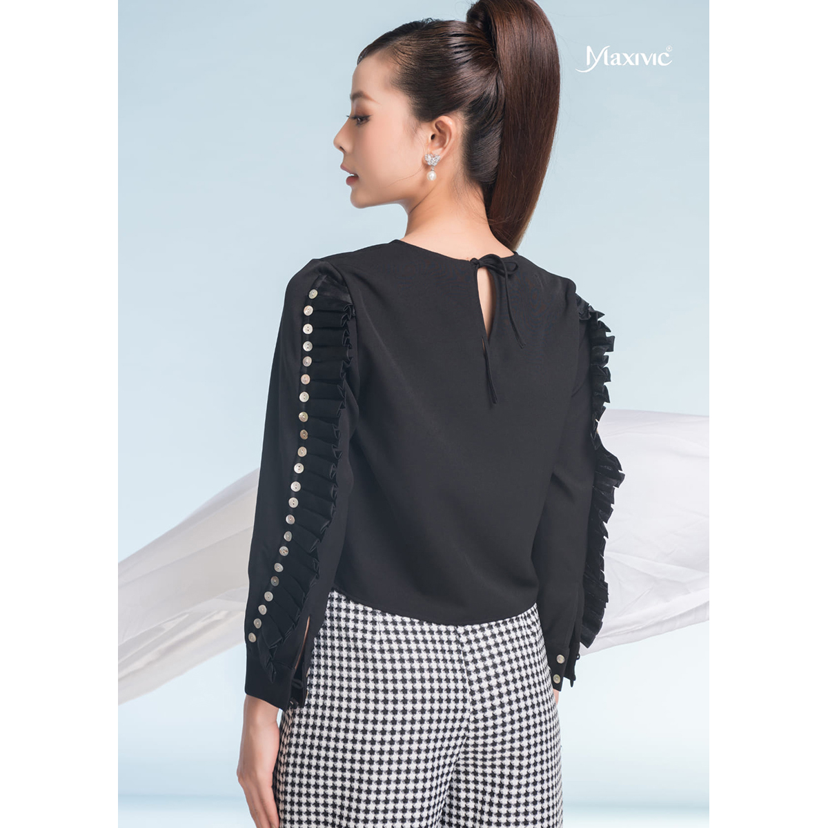Set Áo Đen Tay Vây Cá Quần Lưng Liền Caro Trắng Đen Maxivic M-SETBO-08 - Kiểu dáng • Quần ống rộng • Phối cùng áo đen tay vây cá - Chất liệu • Quần: