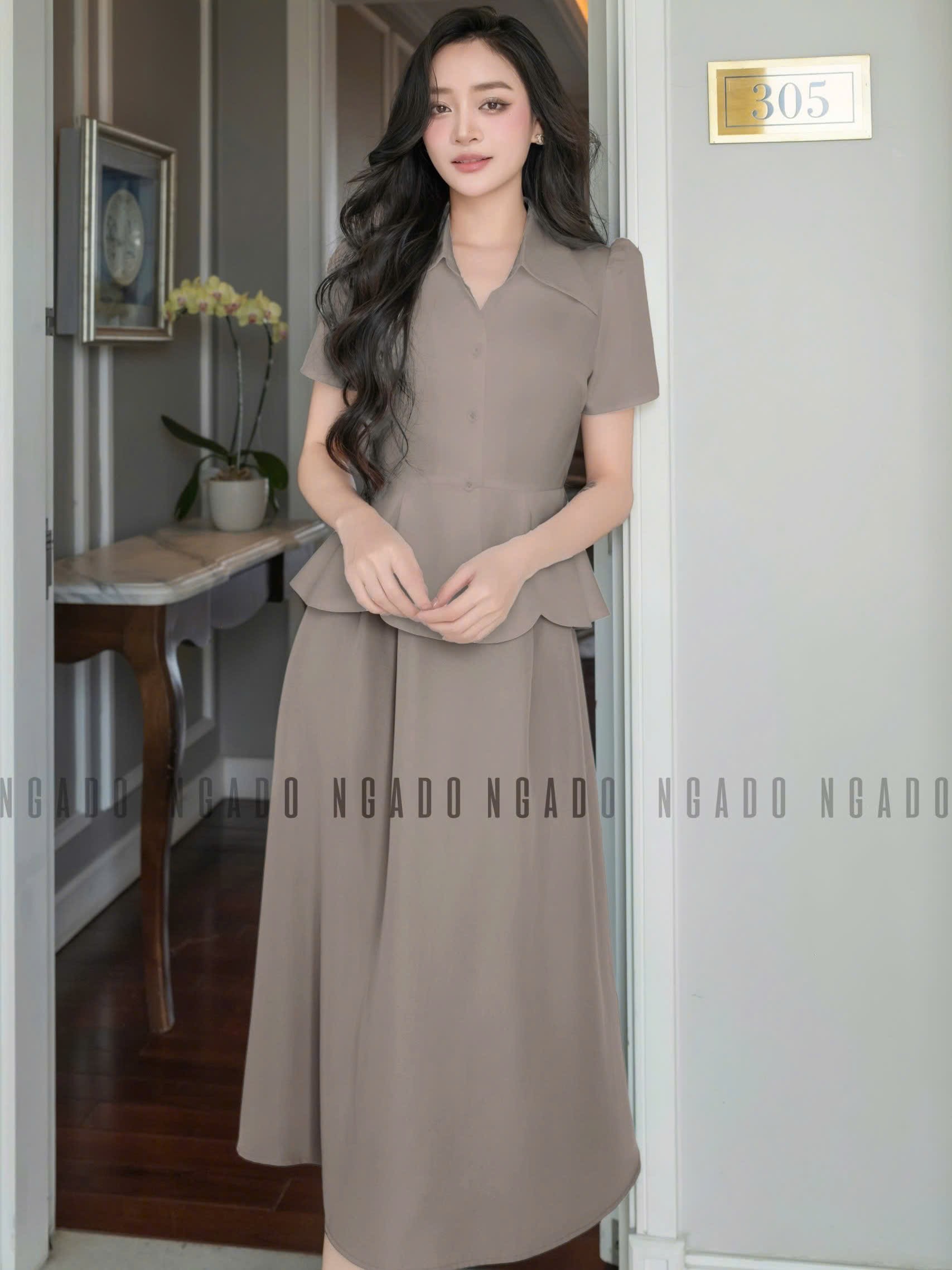 ✨Set áo váy peplum nâu NGADO , set áo váy dài , set áo váy kiểu Nữ