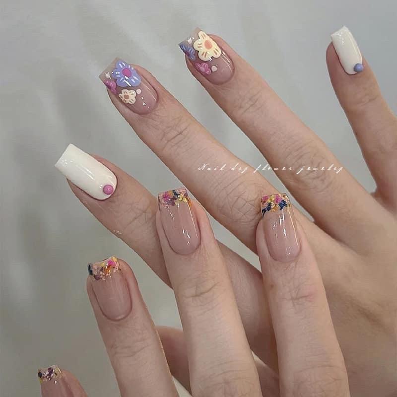 - Trang Trí Hoa Khô: Cắt nhỏ bông hoa khô và đặt lên móng, sau đó phủ lớp gel trong suốt để cố định hoa và tạo hiệu ứng ẩn móng.