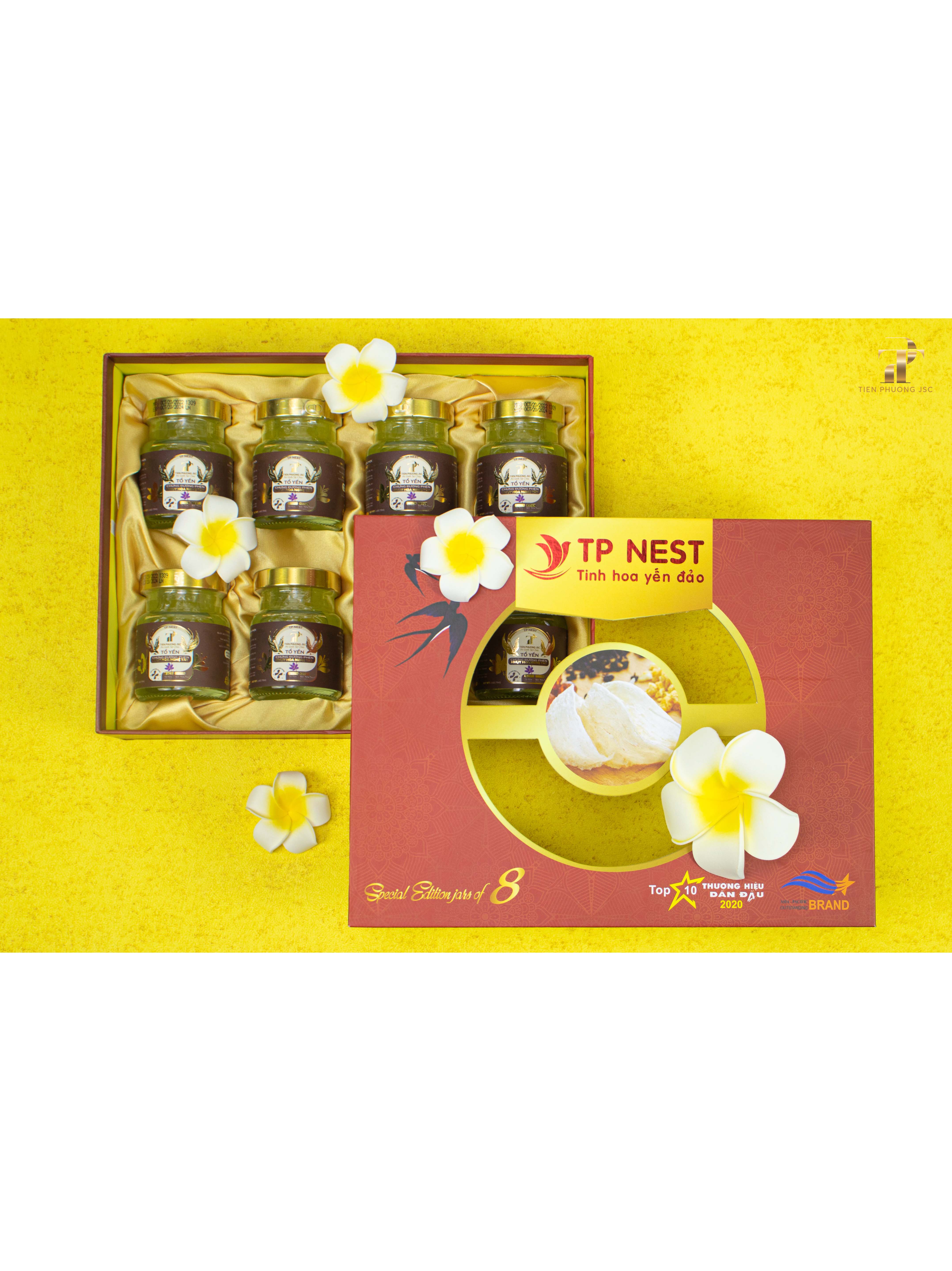 Set hộp quà yến cao cấp 03 - Tiến Phương JSC , bao gồm: - 8 hũ tổ yến chưng Nhụy hoa nghệ tây (70 ml/hũ) - Hộp quà - Túi đựng cao cấp