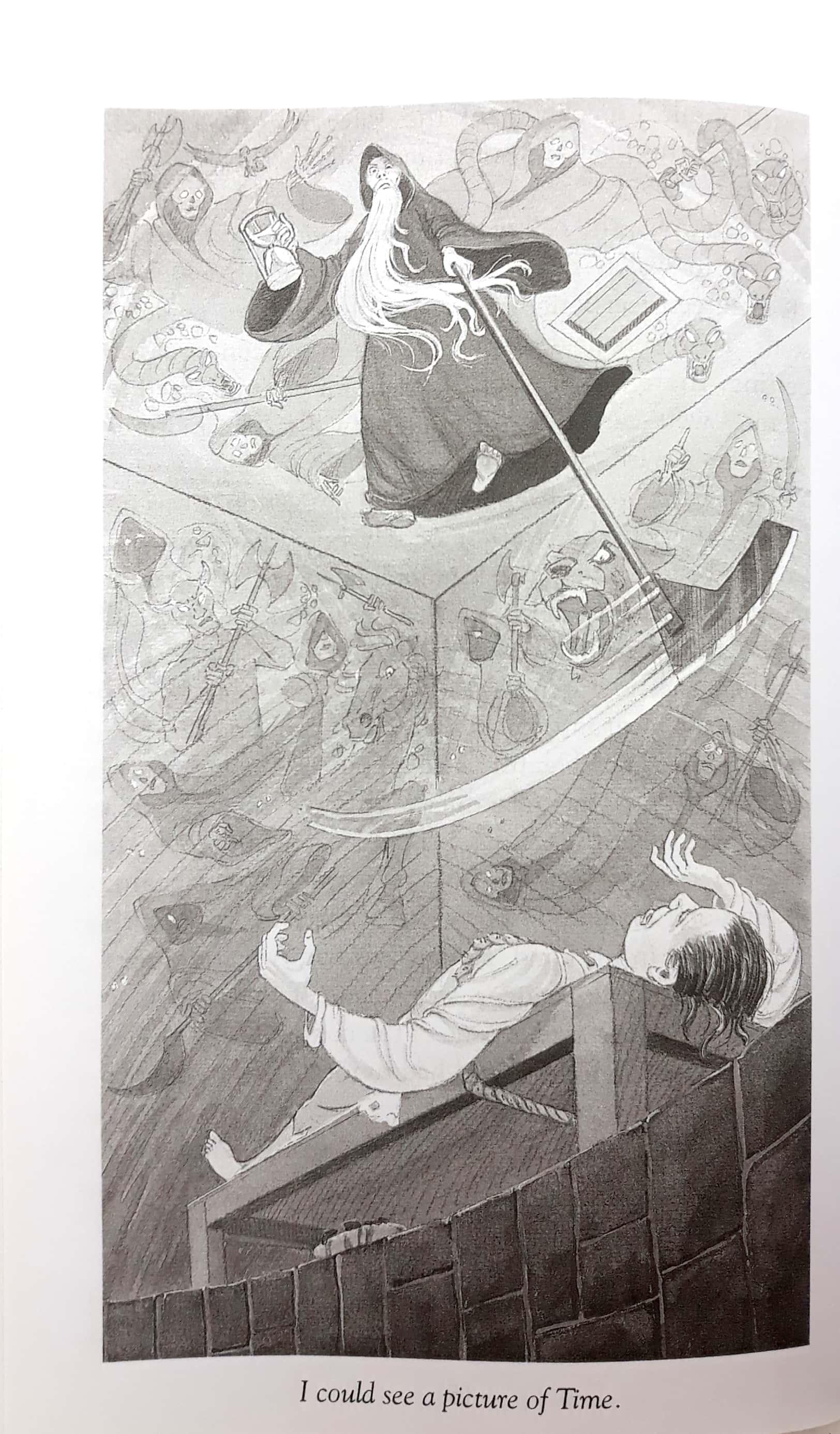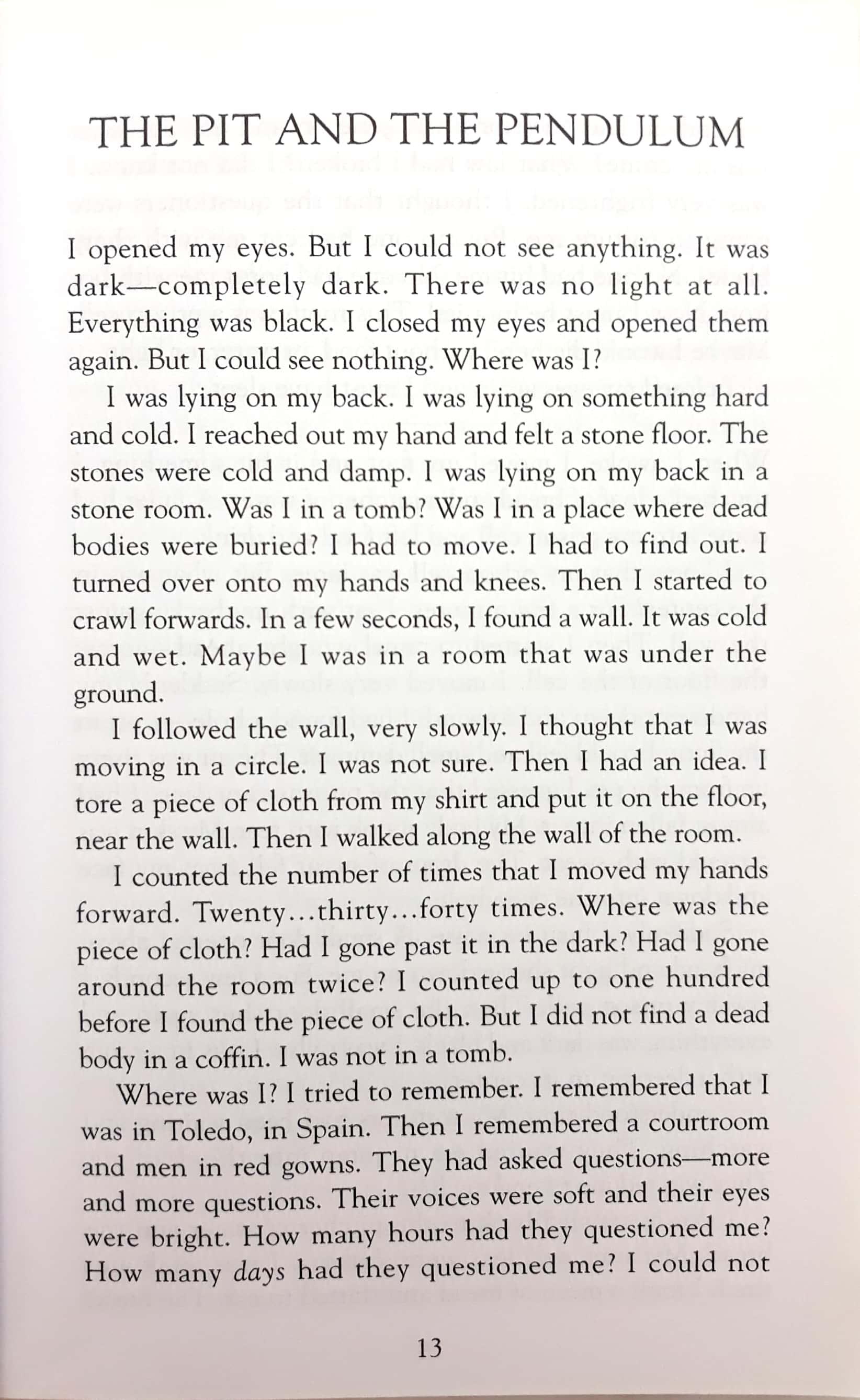 A prisoner wakes up to find himself in a dark cell with a deep pit.