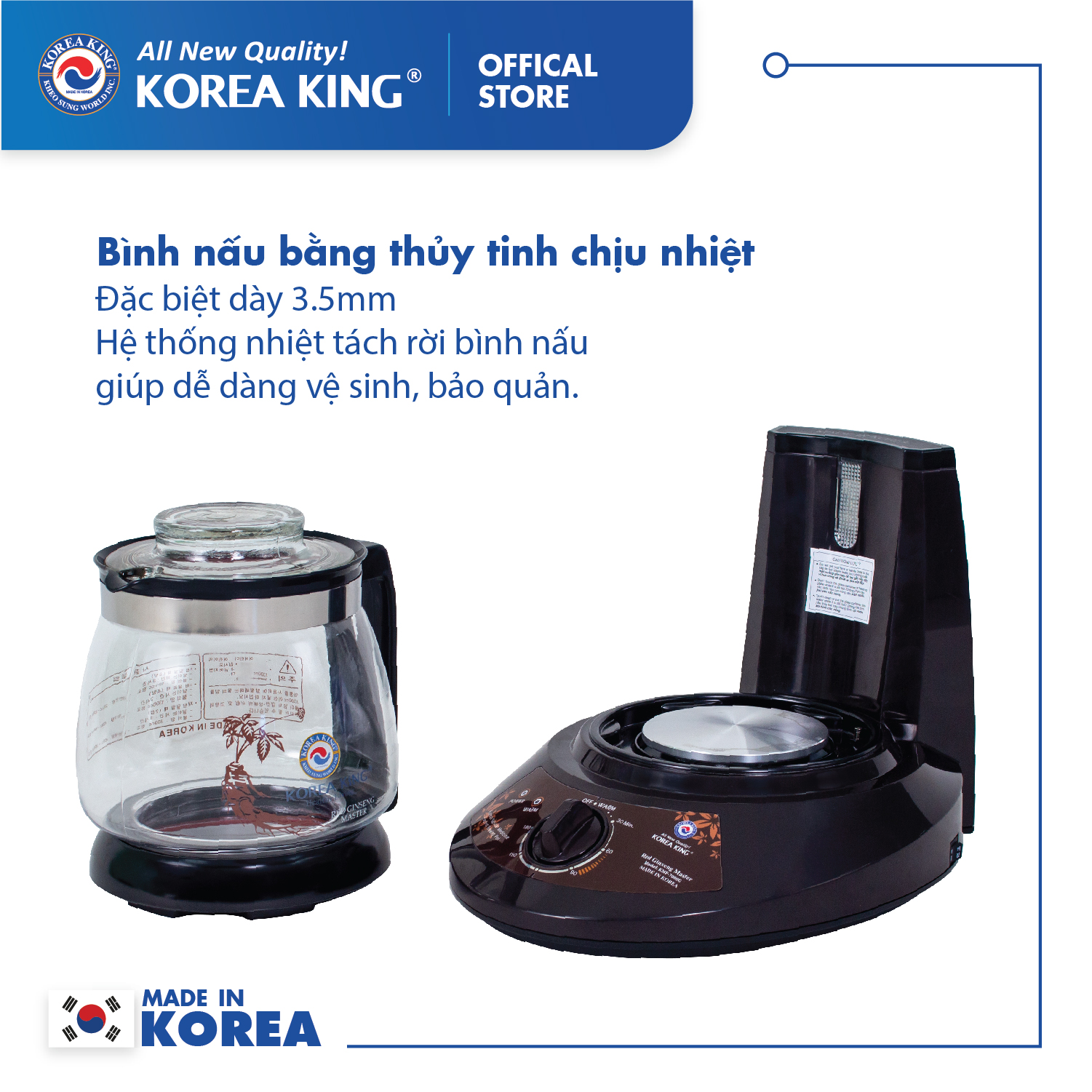 Thông số kỹ thuật Dung tích 3L, Công suất 330W Kích thước (cm): 31D x 26R x 30C Xuất Xứ & Bảo Hành Thương hiệu: KOREA KING ( Thương Hiệu Hàn Quốc ) Xuất xứ: Hàn Quốc, nhập khẩu chính hãng Bảo Hành tại hãng KOREA KING VIET NAM : 12 Tháng Đặc điểm nổi bật -    Công suất mạnh mẽ (330W) cùng dung tích bình nấu lớn(3.0L) giúp tiết kiệm thời gian đun nấu -    Đèn chiếu tia hồng ngoại: diệt khuẩn, giảm bớt mùi khó chịu, tăng tỷ lệ chiết xuất tinh chất từ các loại thuốc thảo dược, nhân sâm, thực phẩm tiềm- Giữ cho nước thuốc luôn tươi mới (bảo quản nước thuốc không bị phân rã. -    Siêu sắc thuốc vận hành hoàn toàn tự động, không cần bạn tốn công sức theo dõi thường xuyên như các sản phẩm sắc thuốc trước kia. Hãy tận hưởng thời gian đơn giản chỉ bằng cách cài đặt thời gian sắc thuốc và để máy tự vận hành. Ngoài ra máy tự động giữ ấm thuốc được sắc ở nhiệt độ (50~70độC) nên có thể uống bất cứ lúc nào. -    Bình nấu bằng thủy tinh chịu nhiệt đặc biệt dày 3.5mm, dung tích lớn khả năng chịu nhiệt cao, bền và dễ sử dụng không rạn nứt trong quá trình sử dụng. giúp bạn dễ dàng quan sát quá trình sắc thuốc.  -    Không cần chắt nước thuốc ra khỏi thuốc sau khi sắc xong. Nhờ thiết kế theo cấu trúc máy hút chân không cực mạnh tự động ép thuốc ra khỏi bã cho chất lượng thuốc tốt.  -    An toàn, tiết kiệm điện nhờ hệ thống cảm biến, cảm ứng chống cháy, chống cạn nước, đảm bảo sức khỏe của người dùng, tăng tuổi thọ sản phẩm. Thuốc sắc không bị khô, cháy xém nhờ đáy bình nấu được phủ 1 lớp đá đặc biệt và bộ phận cảm ứng nhiệt được gắn ở đây -    Bình nấu có dung tích 3000ml nên có thể chưng cất một lần hai thang thuốc, tiết kiệm thời gian và điện năng tối ưu, dễ sử dụng, vệ sinh nhờ thiết kế hệ thống nhiệt tách rời bình nấu, không lo nước xâm nhập vào mâm nhiệt làm hư hỏng bộ phận sinh nhiệt của ấm. -    Nút điều khiển cơ dễ dàng sử dụng.  -    Lưu ý: : Bạn có thể sử dụng bình nhựa kèm theo sản phẩm để nấu thuốc bằng cách bỏ thuốc vào bình nhựa sau đó bỏ vào bình thủy tinh rồi đậy nắp lại và chỉnh thời gian nấu, sau khi nấu thuốc sẽ được lọc sạch hoặc nếu không thích sử dụng bình nhựa thì bỏ thuốc trực tiếp vào bình thủy đinh để nấu cũng được, thì sau khi nấu xong bạn phải lọc cặn rồi mới uống nhé. Khi bình chứa đầy thuốc và nước (trọng lượng >2kg) khi sử dụng nên dùng hai tay đỡ phần đáy bình !