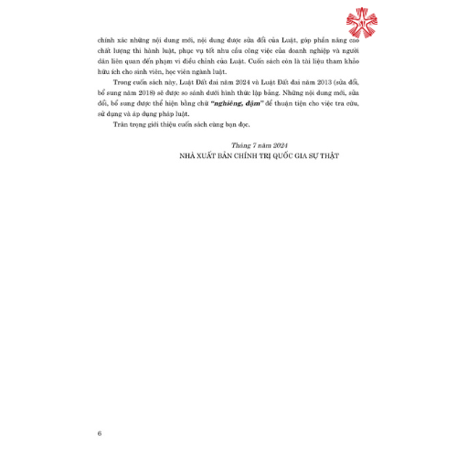 Trong cuốn sách này, Luật Đất đai năm 2024 và Luật Đất đai năm 2013 (sửa đổi, bổ sung năm 2018) sẽ được so sánh dưới hình thức lập bảng. Những nội dung mới, sửa đổi, bổ sung được thể hiện bằng chữ “nghiêng, đậm” để thuận tiện cho việc tra cứu, sử dụng và áp dụng pháp luật.