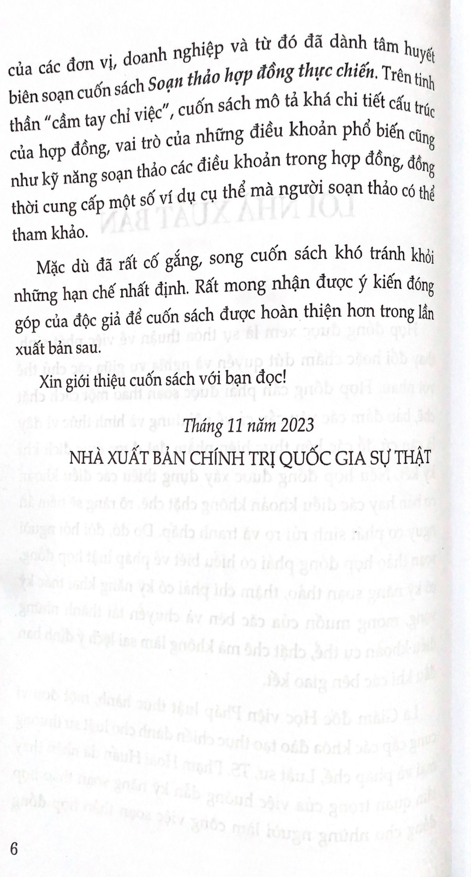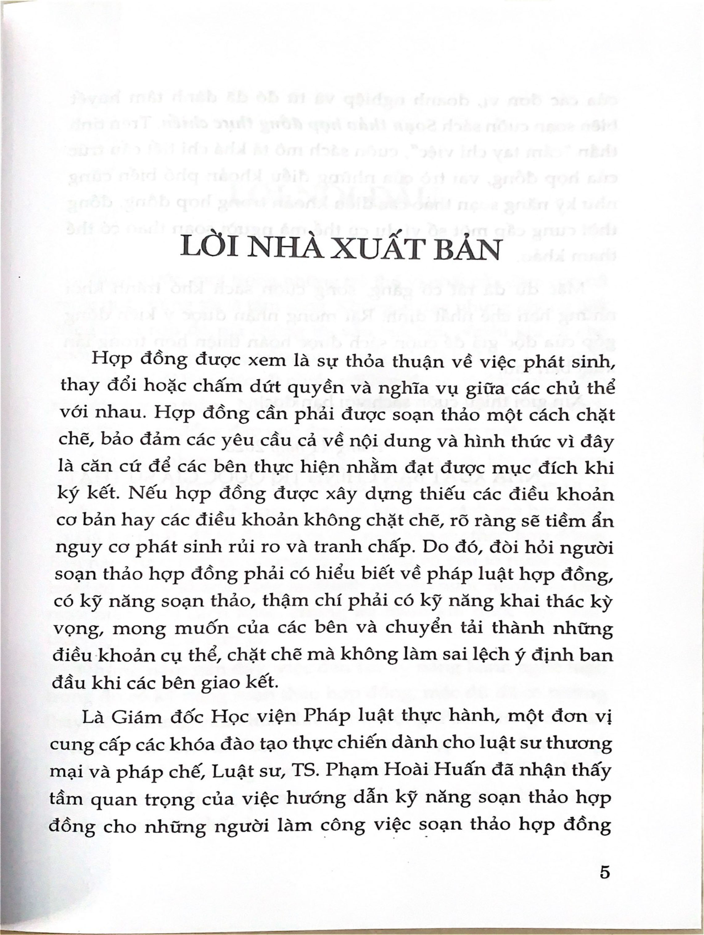 Là Giám đốc Học viện Pháp luật thực hành, một đơn vị cung cấp các khóa đào tạo thực chiến dành cho luật sư thương mại và pháp chế, Luật sư Phạm Hoài Huấn đã nhận thấy tầm quan trọng của việc hướng dẫn kỹ năng soạn thảo hợp đồng cho những người làm công việc soạn thảo hợp đồng của các đơn vị, doanh nghiệp và từ đó đã dành tâm huyết biên soạn cuốn sách “Soạn thảo hợp đồng thực chiến”. Trên tinh thần “cầm tay chỉ việc”, cuốn sách mô tả khá chi tiết cấu trúc của hợp đồng, vai trò của những điều khoản phổ biến cũng như kỹ năng soạn thảo các điều khoản trong hợp đồng, đồng thời cung cấp một số ví dụ cụ thể mà người soạn thảo có thể tham khảo.