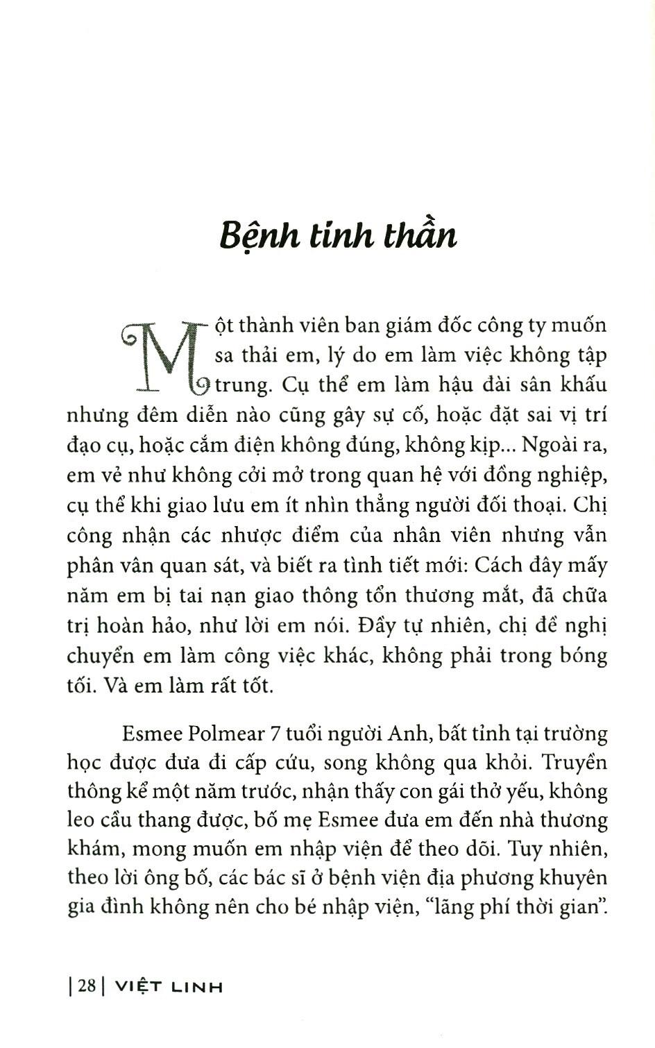 SOI GƯƠNG BẰNG NGƯỜI Bạn thân mến, Cuốn sách bạn cầm trên tay, lần này là tuyển hợp những bài viết đã đăng trên các báo, tạp chí Đẹp, Tuổi Trẻ, Thời báo kinh tế Sài Gòn, Phụ nữ, Thế giới tiếp thị từ cuối năm 2015 đến đầu năm 2019. Một vài tính thời sự trong đây có thể thay đổi nhưng ý nghĩa nhân văn, thế sự vẫn nguyên vẹn. Vẫn là cách xếp đặt ngẫu nhiên theo thứ tự chữ cái như các cuốn in trước, chỉ khác bên dưới mỗi bài viết lần này, tác giả không ghi tên báo, ngày tháng đã đăng; như một tiết chế tính thông tấn cho những câu chuyện, câu chữ, xét cho cùng chỉ để đeo mang chút nhân tì VIỆT LINH SOI GƯƠNG BẰNG CHỊ Tôi đọc bản thảo Soi gương bằng người của chị Việt Linh trong những ngày sương mùa xuân còn chưa tan ở Hà Nội. Tôi nghĩ rằng, bạn đọc chỉ cần đọc tên cuốn sách thôi, cũng có thể hình dung ra phần nào tinh thần của nó. Soi gương bằng người, nhìn người để soi mình, lặng yên nhìn cuộc đời để nhận ra những chân giá trị giản dị mà nhân văn nhất. Tôi rất thích cái tinh thần ấy. Có lẽ là, đến một thời điểm nhất định, sau những năm tháng quẫy đạp để trồi lên khỏi cái bề mặt cuộc sống, nhằm đạt tới những cái đích nào đó, nhằm ghi danh mình vào đâu đó, người ta sẽ muốn dừng lại. Dừng lại và điềm tĩnh nhìn cái cuộc sống đang diễn ra, đang trôi đi ngay bên cạnh mình. Nếu không dừng lại mà cứ lao đi với tốc độ không thể kìm hãm thì có lẽ cho đến tận lúc nhìn thấy cái chết, cũng không kịp nhận ra mình đã đi qua cuộc đời như thế nào, không thể nào phác họa nổi chân dung cuộc đời. Và khi đọc cuốn sách này, có lẽ, rất nhiều người sẽ muốn dừng lại để nhìn, để lắng nghe, để cảm nhận những gì đang lay động xung quanh. Nhưng để có thể điềm tĩnh như thế, có thể nhìn mọi điều diễn ra xung quanh bằng con mắt bao dung, độ lượng; nghĩ thong thả và sâu sắc, thì phải có không ít những năm tháng sống hết mình, thậm chí có lúc đày đọa mình trong khổ ải của lao động, của tư duy, thậm chí cũng phải đau đớn nhìn những mất mát. Tôi tin vậy.Chị Việt Linh, tôi thích gọi chị là chị Linh, một cách ấm áp, luôn có cách đặt vấn đề bất ngờ và thú vị. Một điều mà chị thường làm, là nghĩ ra tên bài viết trước khi viết. Tôi thấy khá là thú vị. Có những bài viết chị nghĩ ra cái tên từ ba năm trước khi thực sự viết vào nội dung. Tôi thường viết xong mới nghĩ cái tên, chị thì ngược lại. Nó cho thấy một lối tư duy chủ động. Tôi cứ nghĩ rằng lối tư duy ấy sẽ bó buộc cảm xúc của chị, nhưng hóa ra không phải. Chỉ trong vài trăm chữ, vẫn thấy nó phóng khoáng vô cùng. Nó có thể mở ra từ rất nhiều hướng. Nó đủ gây bất ngờ đối với người đọc. Tôi gọi đây là bản lĩnh tư duy. Bản lĩnh này khó có thể đến từ những người trẻ tuổi. Chị Linh, trong cuốn này, vẫn cái giọng điềm tĩnh, thư thả, có cảm giác như chị rủ rỉ tự nói cho mình nghe trước khi viết cho bạn đọc thấy - như là khi chị viết những bài trong cuốn 5 phút với ga xép, in cách đây chưa lâu. Tôi đặc biệt mê cái cách quan sát và chiêm nghiệm của chị. Bất kể chuyện gì, dù lặt vặt nhỏ bé đến đâu, qua sự quan sát của chị, đều mang tới một đúc kết, một triết lý vừa giản dị, vừa sâu sắc. Chị kể chuyện con gái thích ăn món thận, nhưng ở Pháp không có ai lọc phần hạch hôi bên trong giúp chị như các chợ ở Việt Nam, vì vậy, chị rất khó chịu khi phải làm việc đó. Và có lần chị nghĩ ra “Cứ lọc cắt phần thịt tốt xung quanh, cho tới khi đụng nang giữa thì ngưng lại, bỏ qua! Từ khi thực hiện phương pháp “bỏ qua” đó chị không ngán làm thận nữa, hơn vậy, còn nhận ra một suy ngẫm lý thú. Rằng nếu ta chỉ nâng niu những điều tốt đẹp, không để tâm cái xấu thì mọi thứ sẽ trở nên trôi chảy, nhẹ nhàng”. Vâng, bớt để tâm đến cái xấu thì mọi thứ sẽ trở nên trôi chảy, nhẹ nhàng. Lối tư duy này khiến cho mỗi ngày trôi qua của con người ta giữa cộng đồng, với đầy những nhếch nhác nhem nhuốc sẽ trở nên nhẹ nhõm bao nhiêu. Và nó như một quan điểm uyển chuyển nhưng bất biến trong mọi vấn đề mà chị gặp phải trong đời sống. Chị có nhiều năm sống ở nước ngoài, nhưng như chị viết, chị luôn nhớ Sài Gòn, luôn dành dụm tiền để liên tục trở về. Một Sài Gòn thân thương vô cùng trong cảm xúc của chị. Tôi thấy rõ sự yêu mến quê hương của chị. Quê hương còn nghèo khó, lạc hậu, thói hư tật xấu thì vô vàn trong cuộc sống thường nhật, nhưng cho dù là từ nước Pháp nhìn về hay khi đang ở quê nhà, cái nhìn của chị luôn thấm đẫm thương mến, tha thiết, độ lượng. Chấp nhận cả hay lẫn dở, như là một lẽ tất nhiên. Càng đi xa càng thấy mình bé nhỏ, đi xa để biết mình là ai, để ngẫm nghĩ về nơi đã sinh ra, dung dưỡng mình và luôn đón đợi mình quay về. Điều này