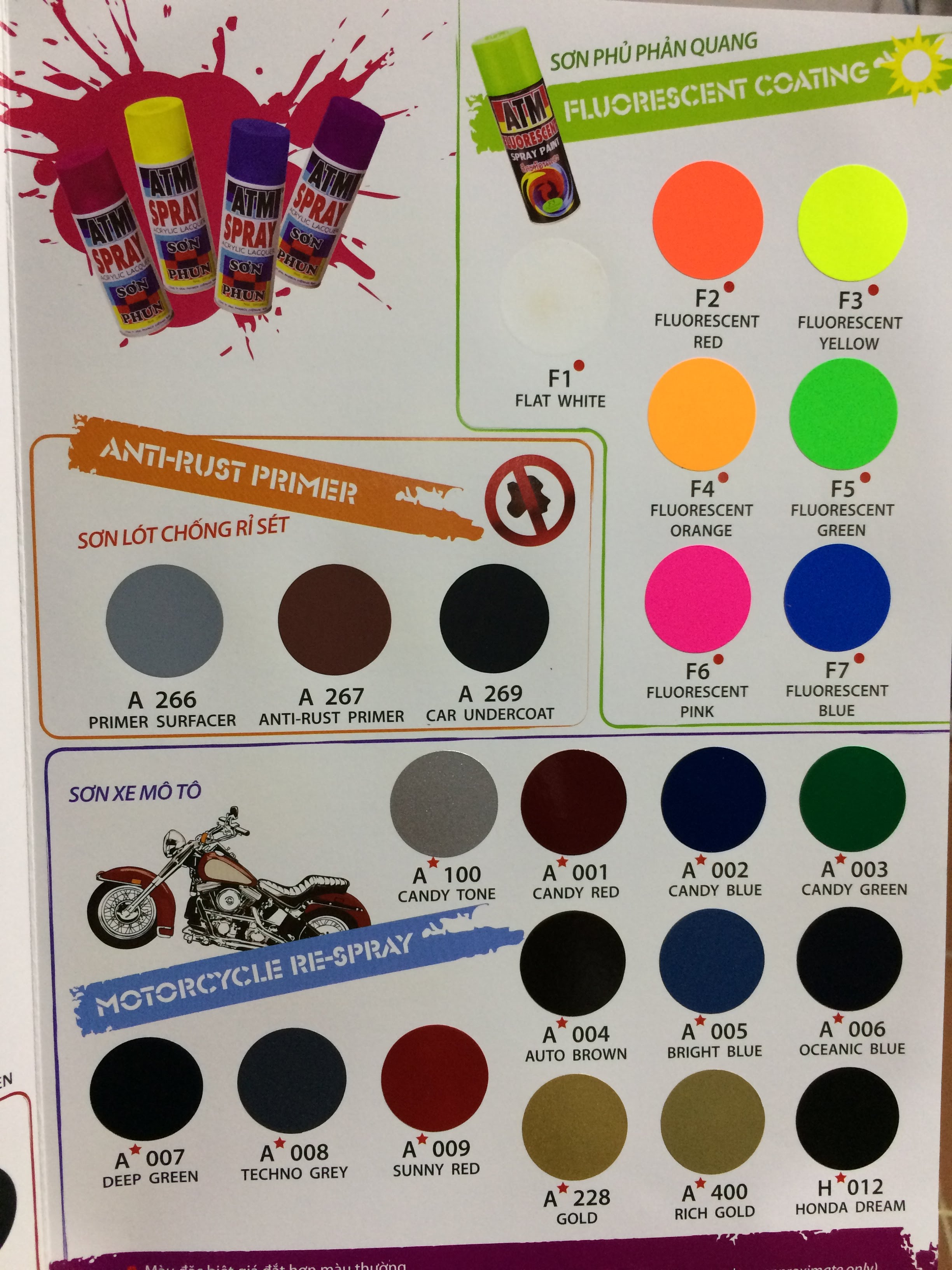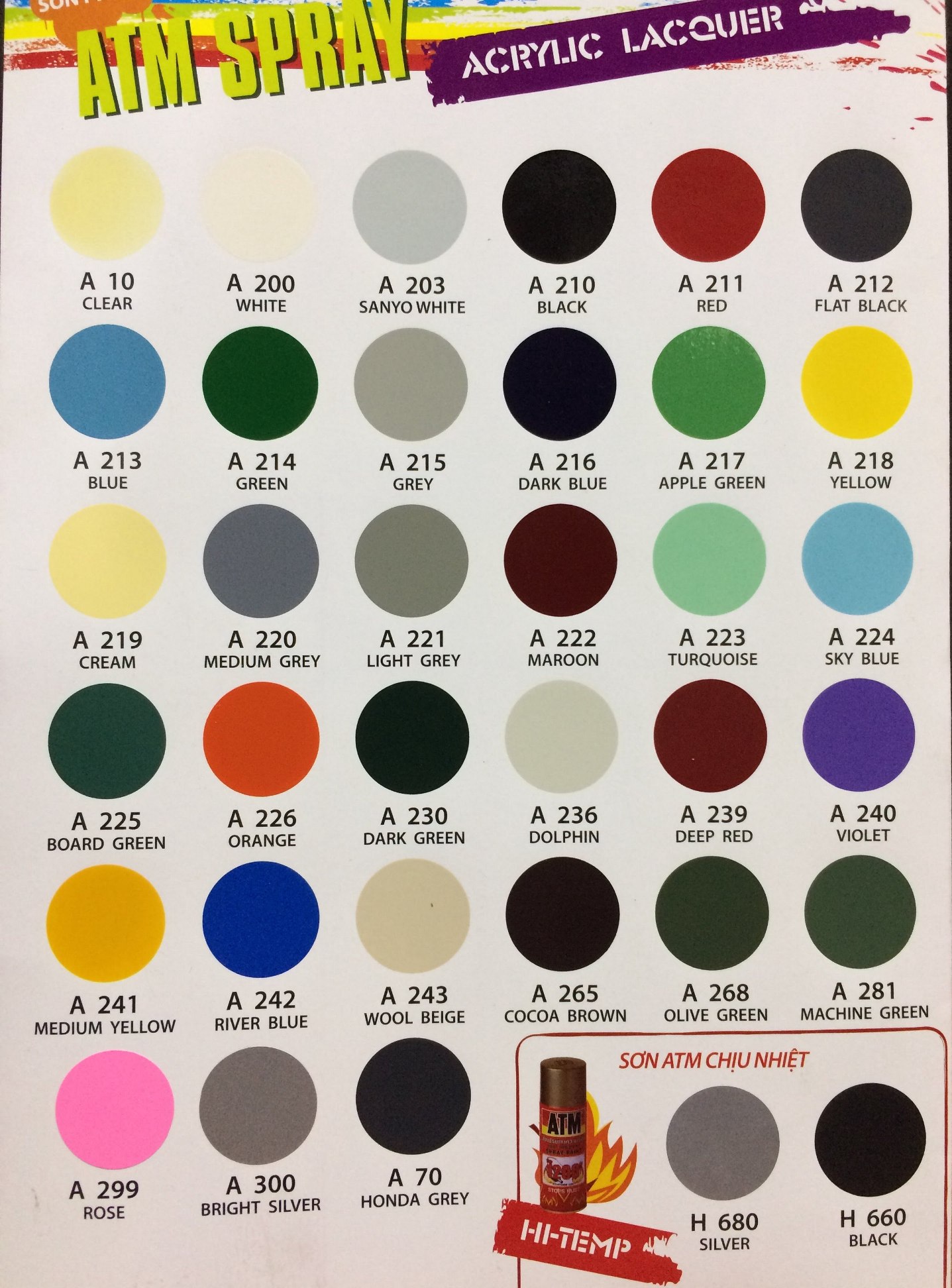 SƠN PHUN “ATM” ACRYLIC: Đặc chế từ hỗn hợp nhựa N/C và ACRYLIC, được đóng gói dưới dạng bình xịt cầm tay rất tiện dụng, dùng sơn để trang trí cho các bề mặt bằng gỗ và kim loại như: đồ gia dụng, bàn, ghế, đồ chơi trẻ em, xe đạp, xe máy
