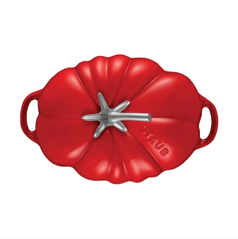 Mua tại TiktokNồi được thiết kế hình cà chua là sản phẩm đặc biệt của Staub. Bên trong nồi được phủ lớp men đen phù hợp với các món ninh, hầm, nướng và có thể đặt trên bàn ăn.