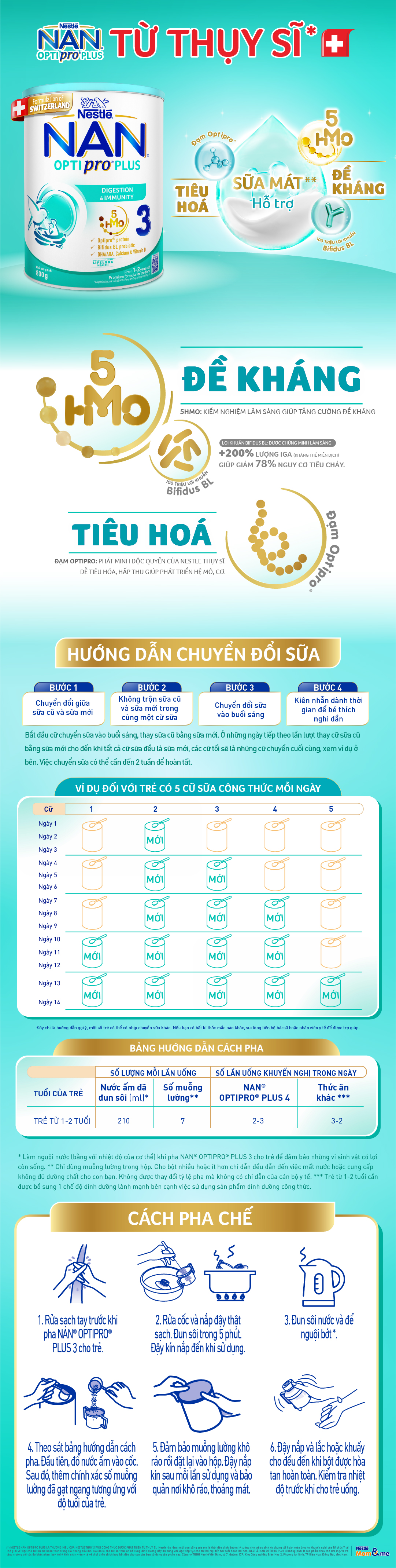 - Canxi & Vitamin D: hỗ trợ phát triển chiều cao. Tìm hiểu thêm: https://www.nestlemomandme.vn/nan-optipro-plus-4 Nestlé tin rằng nuôi con bằng sữa mẹ là khởi đầu dinh dưỡng lý tưởng cho trẻ sơ sinh và chúng tôi hoàn toàn ủng hộ khuyến nghị của Tổ chức Y tế Thế giới về việc cho trẻ bú mẹ hoàn toàn trong sáu tháng đầu đời, sau đó là cho trẻ ăn thức ăn bổ sung dinh dưỡng đầy đủ cùng với việc tiếp tục cho trẻ bú mẹ đến hai tuổi hoặc lâu hơn. Chúng tôi cũng nhận thấy rằng việc nuôi con bằng sữa mẹ không phải lúc nào cũng là một lựa chọn khả thi cho các bậc cha mẹ, chúng tôi khuyên bạn nên được tư vấn bởi nhân viên y tế về cách nuôi dưỡng trẻ và thời điểm nên cho ăn thức ăn bổ sung. Nếu bạn quyết định không cho con bú sữa mẹ, hãy nhớ rằng quyết định như vậy có thể khó đảo ngược và sẽ có những ảnh hưởng về mặt xã hội và tài chính. Việc cho trẻ bú bình một phần sẽ làm giảm nguồn cung cấp sữa mẹ. Sữa công thức dành cho trẻ sơ sinh phải luôn được pha chế, sử dụng và bảo quản theo hướng dẫn trên nhãn để tránh rủi ro cho sức khỏe của trẻ. Không bảo quản sản phẩm quá lâu với môi trường nhiệt độ cao. Phải sử dụng trong vòng 3 tuần sau khi mở hộp. Sản phẩm chính hãng được nhập khẩu và phân phối bởi Công ty TNHH Nestlé Việt Nam.