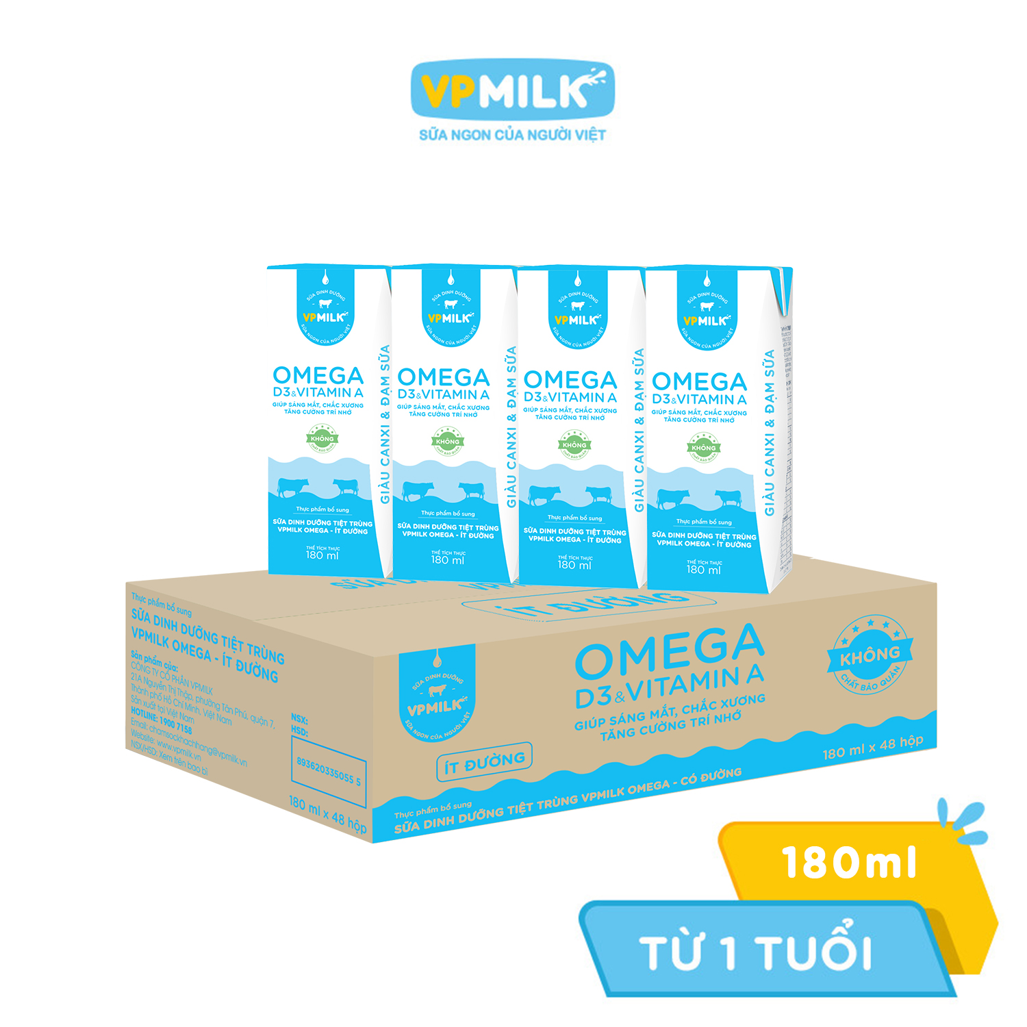 ✨Sữa Dinh Dưỡng Tiệt Trùng VPMilk Omega Ít Đường dạng hộp cho bé trên 1 tuổi 180ml (thùng 48 hộp)