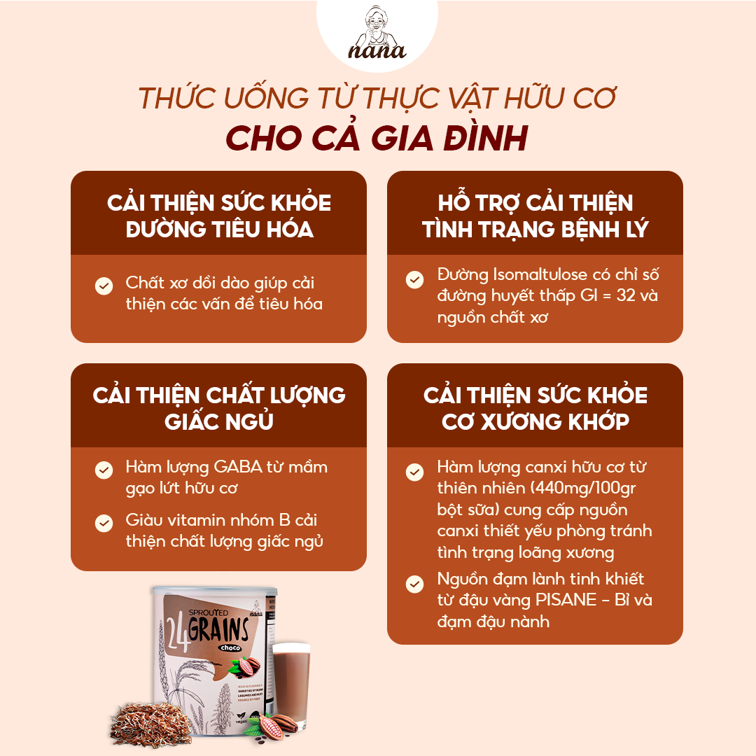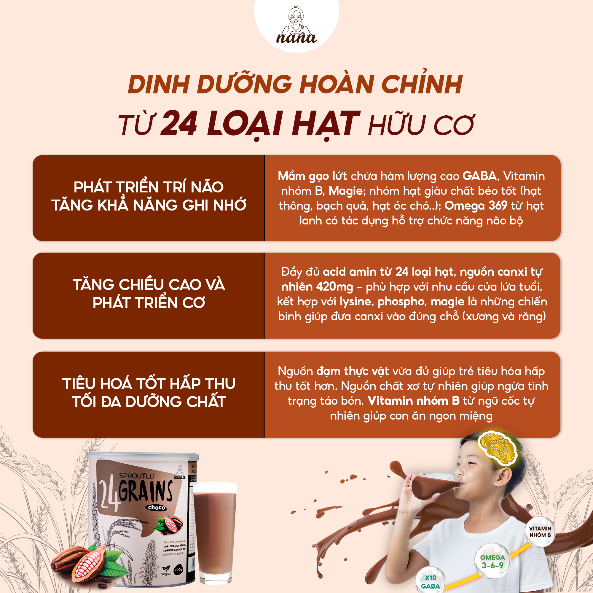 - 24 loại hạt "siêu thực phẩm": nhóm ngũ cốc - nhóm hạt giàu chất béo tốt - nhóm giàu chất xơ hòa tan, vitamin & khoáng chất - nhóm hạt giàu đạm hoàn chỉnh dễ tiêu hóa. DINH DƯỠNG TỪ GẠO LỨT HỮU CƠ VỚI CÔNG NGHỆ NẢY MẦM Hạt nảy mầm thương mại được chế biến trong môi trường vô trùng và thường được sấy khô hoặc khử nước trước khi đóng gói để ngăn ngừa nấm mốc cũng như nguy cơ bệnh tật do thực phẩm, vì khó tạo ra một môi trường vô trùng tại nhà. 24Grains giàu dinh dưỡng & các loại vitamin khoáng chất từ hạt gạo lứt hữu cơ nảy mầm. Trong quá trình nảy mầm, hàm lượng các vitamin, khoáng chất & đạm đều tăng lên rõ rệt. Các dưỡng chất quan trọng như GABA, lysin, Vitamin E, magie, chất xơ, niacin, B1, B6 & B12 cũng được tìm thấy trong hạt nảy mầm với giá trị đặc biệt cao. BỔ SUNG TRỌN VẸN DƯỠNG CHẤT TỰ NHIÊN CHO TRẺ TỪ 3 TUỔI
