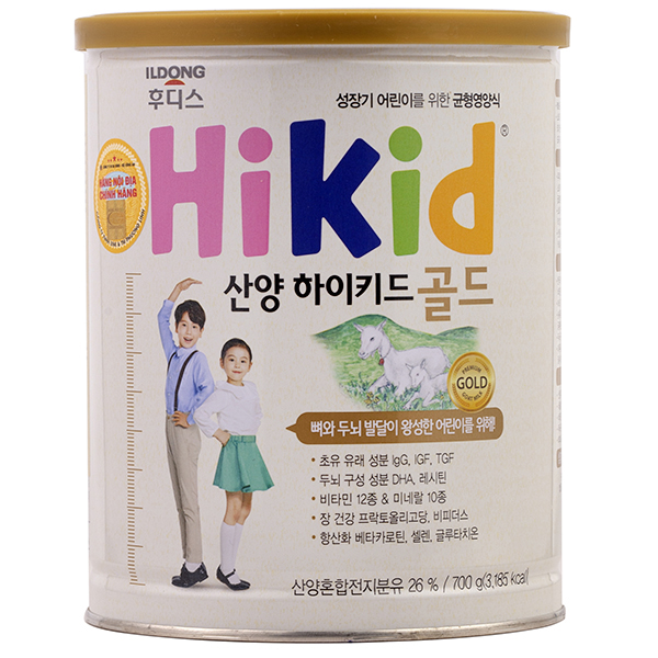 Mua tại TiktokSữa dê Hikid Hàn Quốc hộp 700g với công thức đặc biệt giúp bổ sung canxi và vitamin D phát triển chiều cao và cân nặng bé vượt trội. được chiết xuất từ nguồn sữa dê Hàn Quốc, những con dê được chăn thả trong điều kiện tự nhiên tại các vùng núi cao của Hàn Quốc. Xuất xứ: Hàn Quốc Quy cách: hộp thiếc 700gr Mã vạch: 8801157117809 Thương hiệu: ILDONG Độ tuổi sử dụng: 1 đến 9 tuổi