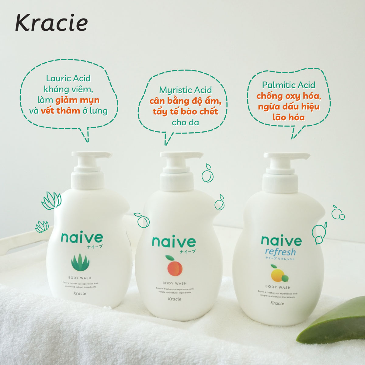 Mua tại TiktokSữa Tắm Chiết Xuất Từ Lô Hội Kracie Naive Body Wash ( Aloe) 530ml Thể Tích Thực: 530 ml Số Lô: In trên sản phẩm Mã Vạch: 4901417169525 Xuất xứ: Nhật Bản SỮA TẮM TẠO BỌT DƯỠNG ẨM với thành phần làm sạch 100% chiết xuất từ thực vật nguyên chất như:Lô hội ( Nha đam ) ,kết hợp công thức làm sạch sâu giúp làm sạch bụi bẩn , bã nhờn từ sâu lỗ chân lông , đồng thời còn giúp da trở nên sáng đều màu, cải thiện tình trạng viêm nang lông , mụn bởi tính kháng khuẩn có trong thành phần Nghệ .Hương dịu nhẹ , phù hợp cho mọi loại da ngay cả làn da mỏng manh của trẻ nhỏ *DÀNH CHO LÀN DA CỦA CẢ GIA ĐÌNH VỚI LỚP BỌT NHẸ NHÀNG LÀM SẠCH DA.Công Dụng : Sữa tắm làm sạch bụi bẩn và tế bào da chết có trên da, giúp dưỡng ẩm sâu và săn chắc da, bảo vệ làn da, giúp da mềm mại, mịn màng, khỏe đẹp. Sản phẩm với mùi hương dễ chịu.. Cách Dùng : Sau khi làm ướt cơ thể ,cho một lượng vừa đủ ra tay, thêm nước tạo bọt rồi massage nhẹ nhàng khắp cơ thể , cuối cùng tắm sạch lại bằng nước. Bảo Quản: Tránh để nơi quá lạnh và ánh nắng trực tiếp vào sản phẩm, để xa tầm tay trẻ em khi không sử dụng. Lưu Ý: Khi dùng nếu có biểu hiện như mẩn ngứa hay có triệu chứng gì bất thường thì ngừng không được sử dụng Thành Phần : Water, Lauric Acid, Myristic Acid, Palmitic Acid, Potassium Hydroxide, Glycol Distearate, Glycerin, Stearic Acid, Fragrance, Sodium Chloride, Cocamide Mea, Potassium Chloride, Hydroxypropyl Methylcellulose, Sodium Laureth Sulfate, Polyquaternium-7, Disodium Edta, Dipropylene Glycol, Sodium Benzoate, Butylene Glycol, Aloe Barbadensis Leaf Extract, Sodium Citrate, Acetyl Glucosamine, Phenoxyethanol, Sodium Sulfite, Alpinia Speciosa Leaf Extract