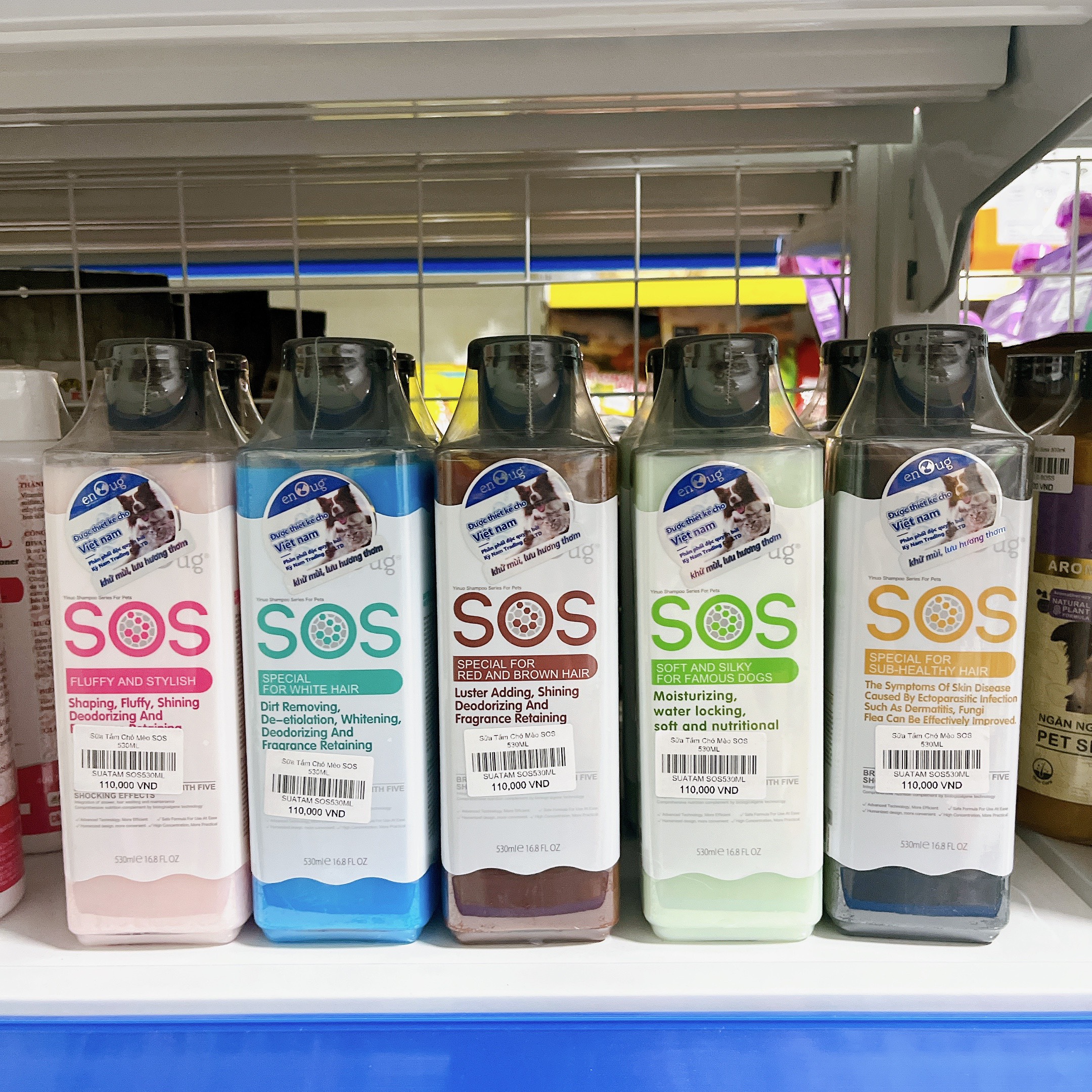 - SOS XANH DƯƠNG: dành riêng cho chó mèo lông màu trắng, có tác dụng làm mềm mượt lông, phục hồi hư tổn đối với thú cưng có bộ lông bị khô, xơ trở nên bóng, khỏe, trắng hơn và không bị bạc màu.