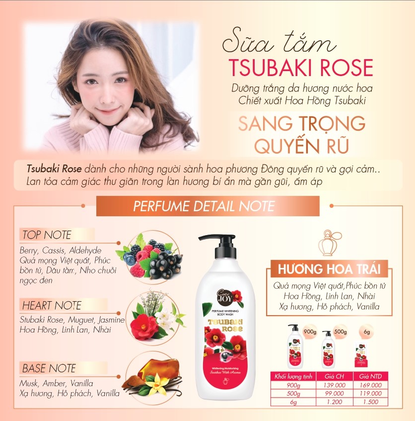 - Mở đầu với nốt hương Berry chín mọng ngọt ngào, được thúc đẩy bởi nốt hương hoa Izu Oshima Tsubaki, Linh lan, Nhài ở giữa, níu giữ khứu giác bằng hương thơm ấm áp của Hổ phách, Vani, Xạ hương. Lan tỏa cảm giác thư giãn trong làn hương bí ẩn mà gần gũi, ấm áp. Sữa tắm Coco Joy Tsubaki Rose:
