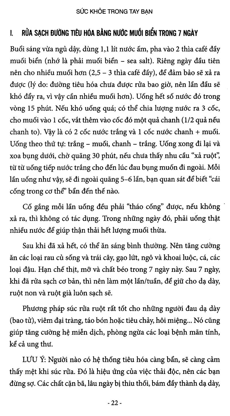 Một cuốn sách với rất nhiều phương pháp chăm sóc sức khỏe, phòng chữa bệnh theo cách tự nhiên, mà tác giả cuốn sách đã tự mình tìm tòi, trải nghiệm, áp dụng cho bản thân, gia đình, bạn bè trong suốt hơn 15 năm qua. “Nhưng thông điệp quan trọng nhất của cuốn sách này có lẽ không phải là những công thức hay phương pháp cụ thể, bởi mỗi phương pháp có thể có tác dụng tốt với một số người, nhưng chưa chắc đã phù hợp với người khác. Điều thu nhận quý giá từ những trang sách của tác giả là niềm tin vào khả năng của mỗi con người làm chủ sức khỏe của mình. Nếu ta có lòng tin và quyết tâm tìm tòi thì những bệnh mãn tính sẽ được chế ngự ở mức độ này hay mức độ khác. Ưu điểm tuyệt đối của những biện pháp tự nhiên là nếu không lạm dụng thì chúng không gây hại thêm cho cơ thể bạn. Nếu muốn cải thiện tình trạng sức khỏe của mình, bạn hãy lên đường thử nghiệm y học thay thế. Cuốn sách sẽ khơi gợi ý tưởng và tạo động lực, hãy dùng nó như hướng dẫn khởi hành. Nhưng để đến đích hay không hoàn toàn phụ thuộc vào độ kiên trì của ý chí và sức dẻo dai của đôi chân bạn. Và như tôi vẫn thường làm – nếu băn khoăn hay thắc mắc, hãy hỏi tác giả Trần Bích Hà.” (trích lời anh Nguyễn Hải, Chủ tịch HĐQT Công ty Du lịch TransViet). Mục lục: Lời giới thiệu Lời nói đầu PHẦN 1: SỨC KHỎE TRONG TAY BẠN Chương 1: Để có một hệ thống tiêu hóa luôn sạch sẽ và khỏe mạnh I. Rửa sạch đường tiêu hóa bằng nước muối biển trong 7 ngày II. Tẩy nấm candida III. Tẩy sỏi gan IV. Nhịn ăn thải độc (master cleanse and juice fasting) Chương 2: Duy trì phương thức sống lành mạnh I. Chế độ ăn uống, sinh hoạt hợp lý phòng ngừa bệnh tật II. Một số lựa chọn và chế biến thực phẩm tốt cho sức khỏe Chương 3: Tự chữa bệnh có khó? I. Các bệnh mãn tính II. Cách chữa đau sưng, u (lành) tuyến vú (fbrocystic breast) III. Cách chữa mụn IV. Một cách chữa trào ngược đơn giản và hiệu quả V. Chữa chứng mất ngủ VI. Cách chữa dị ứng VII. Viêm gan siêu vi B VIII. Cách chữa bệnh tuyến giáp IX. Cách chữa huyết áp thấp X. Đau tim và nước XI. Bệnh sẹo hay xơ hóa phổi (pulmonary fibrosis) PHẦN 2: CHỮA UNG THƯ BẰNG CÁC PHƯƠNG PHÁP KHÔNG ĐỘC HẠI Chương 1: Nguyên nhân gây ung thư I. Theo quan điểm chính thống của Tây y II. Các quan điểm chưa chính thống về nguyên nhân gây ung thư III. Chế độ ăn uống đối với người bị ung thư Chương 2: Các phương pháp chữa ung thư không độc hại I. Các phương pháp dựa trên việc tăng cường hệ thống miễn dịch hoặc tăng cường trao đổi chất trong cơ thể II. Các phương pháp dựa vào đặc tính của tế bào ung thư, và tạo môi trường để tế bào ung thư chết hoặc không phát triển được III. Chữa ung thư bằng chế độ ăn ketogenic (ketogenic diet) kết hợp với khoảng nhịn ăn ngắn