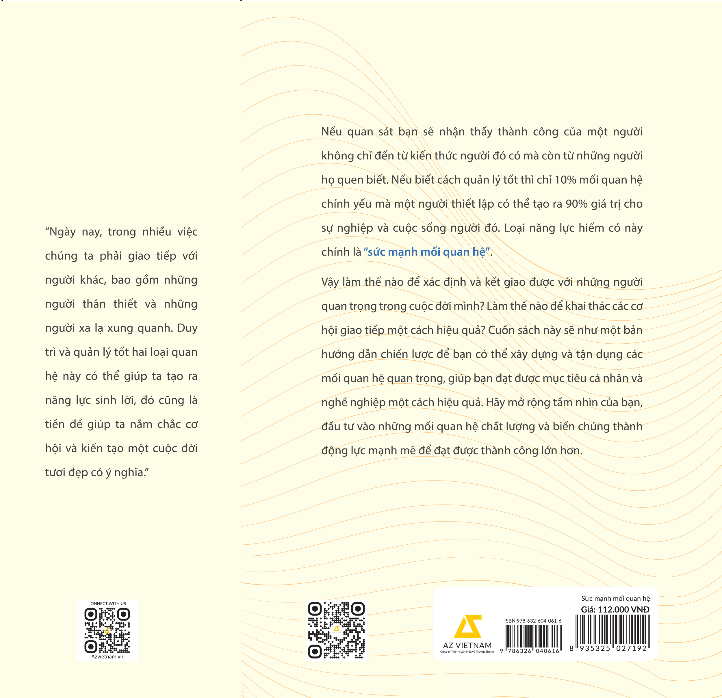 Chúng ta luôn phải giao tiếp với người khác, bao gồm người thân thiết (mối quan hệ vững chắc) và người xa lạ (mối quan hệ mỏng manh). Duy trì và quản lý tốt hai loại quan hệ này giúp ta tạo ra sức mạnh sinh lời, là tiền đề và cơ hội để kiến tạo một cuộc đời tươi đẹp. Đó được gọi là năng lực tận dụng sức mạnh mối quan hệ. Và bạn có thể tìm thấy cách sử dụng và cải thiện nguồn lực này thông qua cuốn sách Sức mạnh của mối quan hệ.