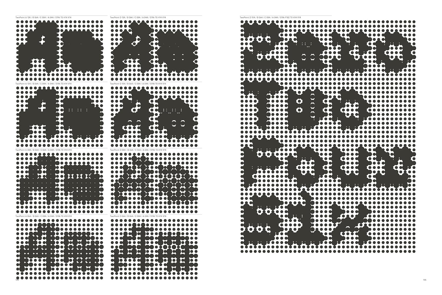 Using a combination of algorithm, chance, and deliberation, a core database of 23 type systems and 198 individual fonts is interpolated to generate millions of hybrid forms in which every dot, line, space, and letter is designed to correspond and collaborate in close harmony. The showcased examples, selected for their distinctively abstract and striking qualities, are printed in three vibrant neon inks and metallic black. The result, far more than a mere catalog of typefaces, demonstrates the power of excavating design problems at their deepest roots, allowing abundant and diverse outcomes to proliferate spontaneously.