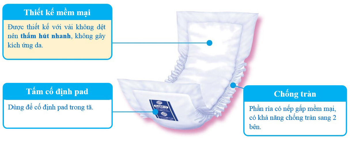 - Dùng cho ban ngày, phù hợp cho cả tã dán và tã quần Thành phần: Polyethylene, Poly-urethane spandex, Hook and loop, Nonwoven fabrics, Tissue, Pulp, Sap, Hot melt glue. Thông số kỹ thuật