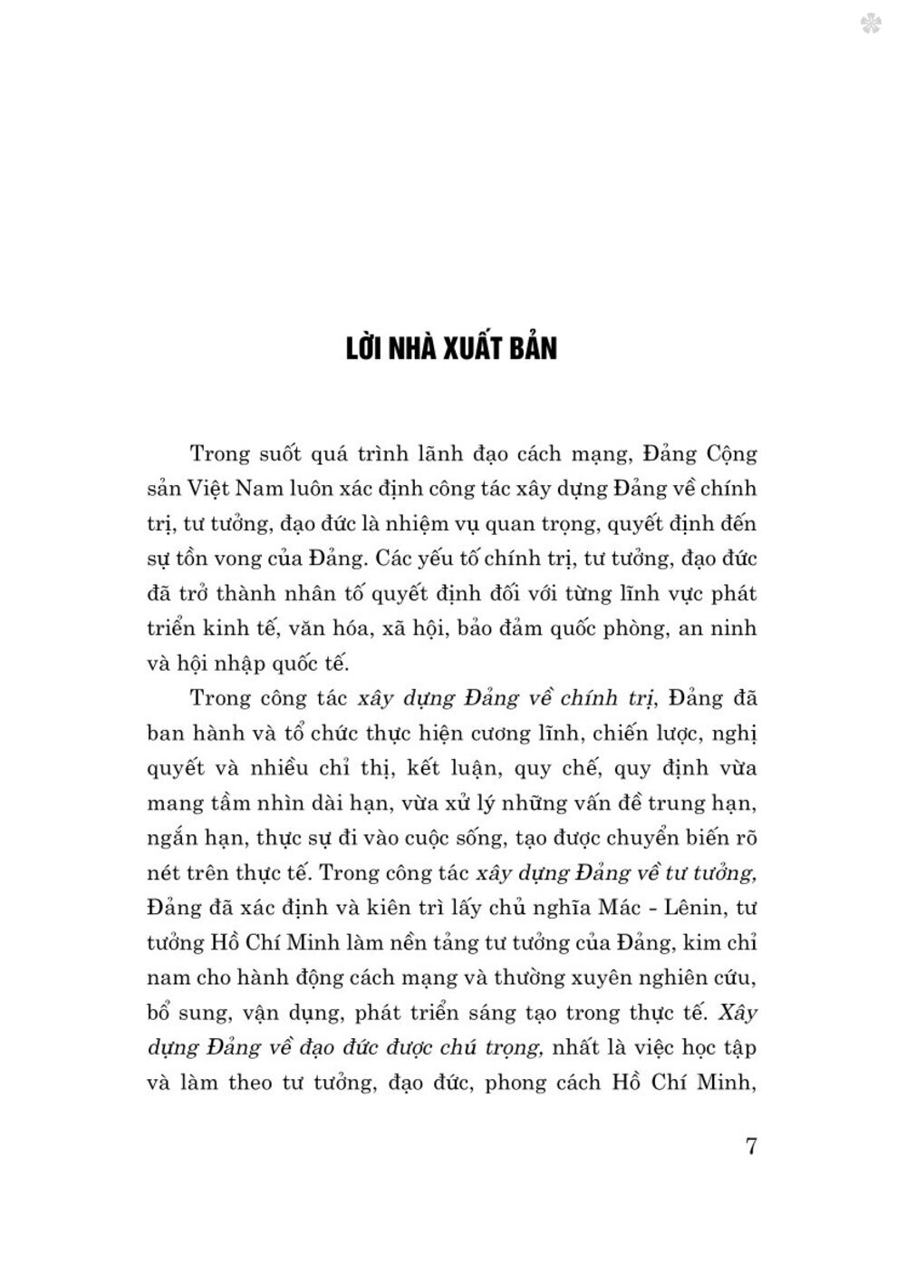 Nhằm góp phần làm rõ nội dung của công tác xây dựng Đảng trong bối cảnh mới, Ban Tuyên giáo Trung ương Đảng tổ chức biên soạn, phối hợp với Nhà xuất bản Chính trị quốc gia Sự thật xuất bảnTài liệu nhận thức và triển khai công tác xây dựng Đảng về chính trị, tư tưởng, đạo đức trong giai đoạn hiện nay. Cuốn tài liệu giúp các tổ chức đảng, cán bộ, đảng viên nhận thức rõ ràng hơn về nhiệm vụ xây dựng Đảng về chính trị, tư tưởng, đạo đức, từ đó triển khai thực hiện hiệu quả các nghị quyết, chỉ thị về công tác này, góp phần củng cố niềm tin của nhân dân đối với Đảng, nâng cao chất lượng đội ngũ đảng viên, xây dựng Đảng trong sạch, vững mạnh. Mặc dù đã có nhiều cố gắng trong quá trình biên soạn, xuất bản, song nội dung tài liệu khó tránh khỏi những hạn chế. Rất mong nhận được ý kiến đóng góp của bạn đọc để nội dung cuốn tài liệu được hoàn thiện hơn trong lần xuất bản sau. Xin trân trọng giới thiệu cuốn tài liệu với bạn đọc.