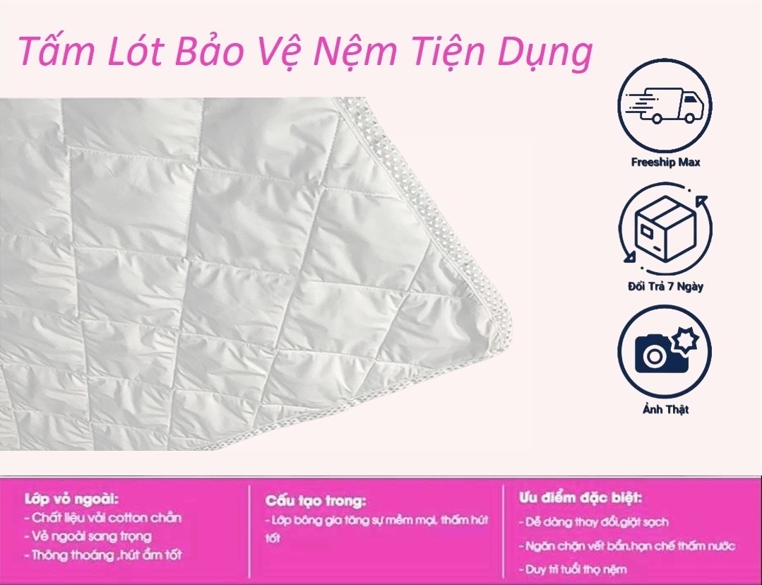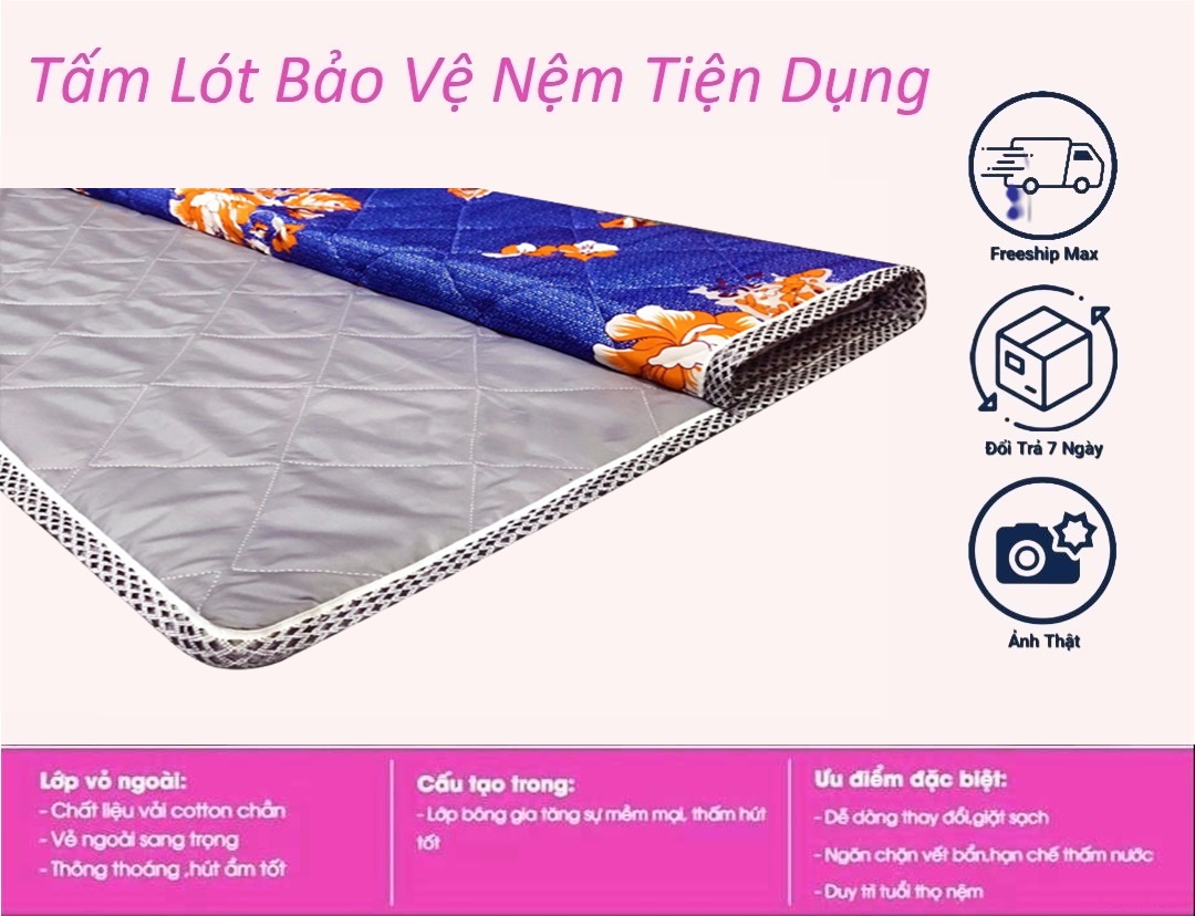 Dùng như tấm làm mềm nệm để bảo vệ tấm nệm hoặc trải sàn, mang theo làm nệm ngủ văn phòng đều được CHẤT LIỆU ---------------------------- - Lớp ngoài: Sử dụng vải Cotton Poly thông