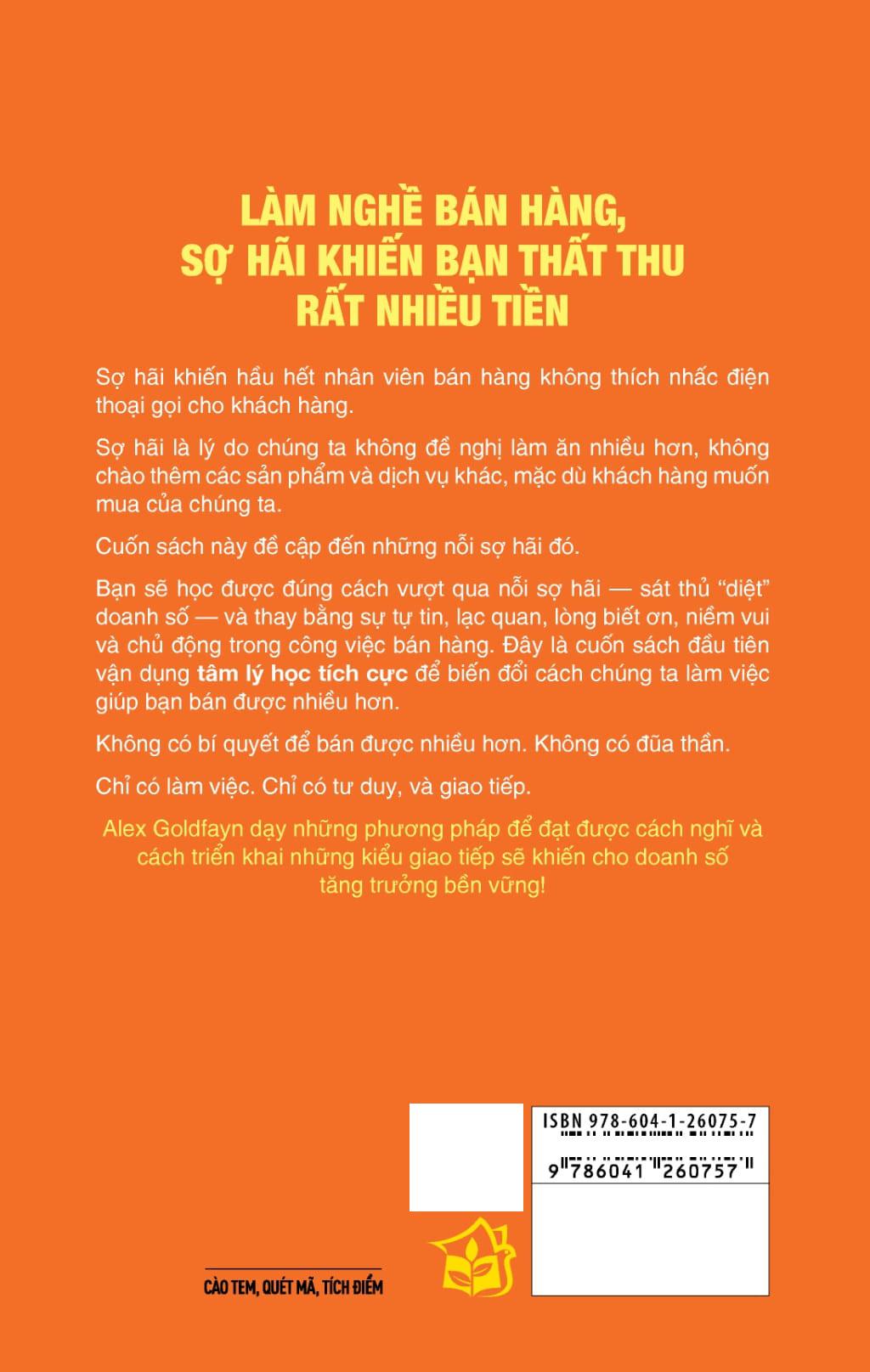 Bạn sẽ học được đúng cách vượt qua nỗi sợ hãi — sát thủ “diệt” doanh số — và thay bằng sự tự tin, lạc quan, lòng biết ơn, niềm vui và chủ động trong công việc bán hàng. Đây là cuốn sách đầu tiên vận dụng tâm lý học tích cực để biến đổi cách chúng ta làm việc giúp bạn bán được nhiều hơn.