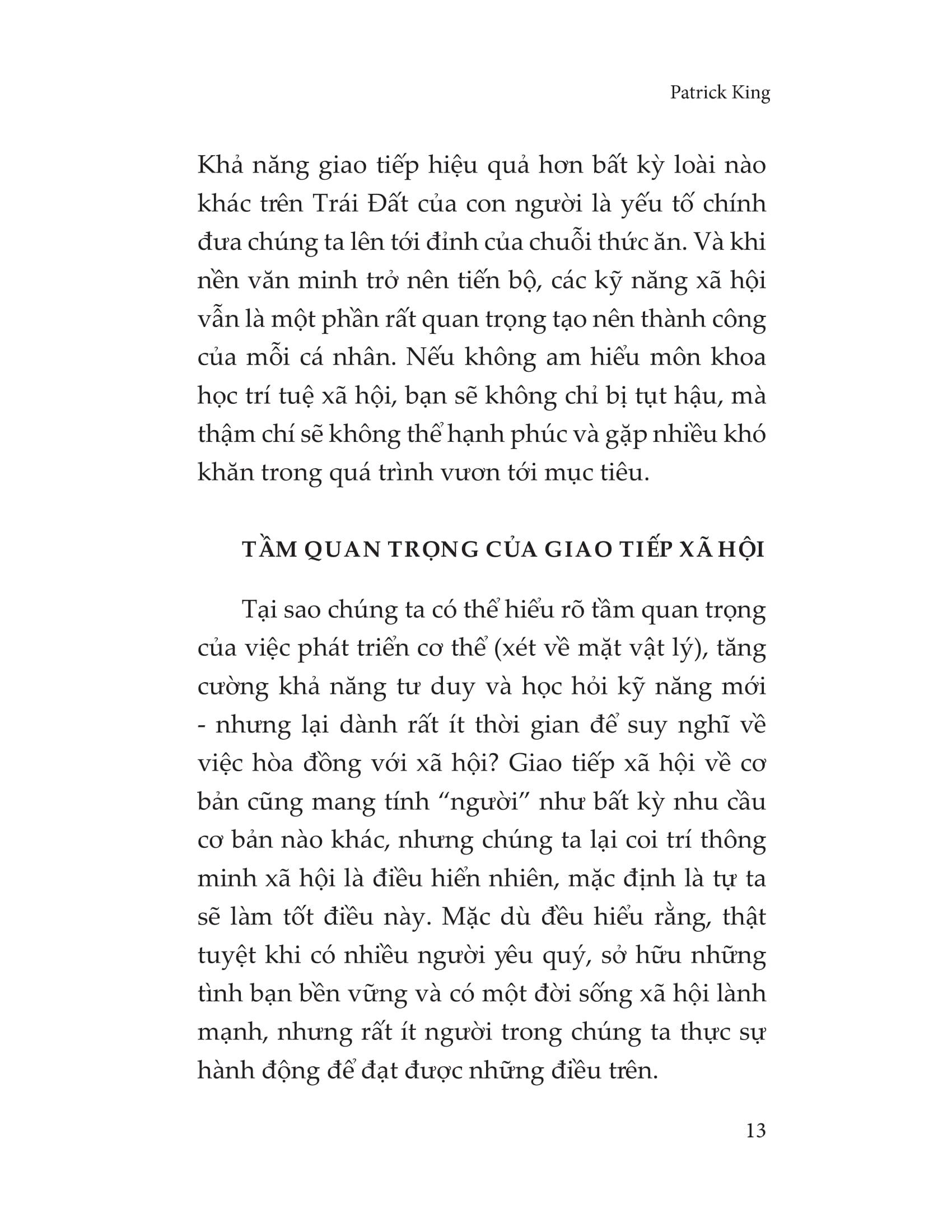 Ở phần kết cuốn sách, tác giả Patrick King không quên liệt kê các thói quen xấu và những lỗi lầm ta dễ mắc phải trong giao tiếp - những hành vi có thể khiến người khác mất đi cảm tình với ta và làm ta trở thành một “thảm họa xã hội”. Thực chất, chỉ riêng việc ý thức được những thói xấu của mình và từng bước cải thiện chúng, ta đã tiến gần hơn đến mục tiêu nâng cao trí thông minh xã hội - nền tảng để ta đạt được nhiều thành công trong mọi mặt đời sống, từ việc học tập, xây dựng sự nghiệp đến duy trì các mối quan hệ sâu sắc với những người thân yêu.