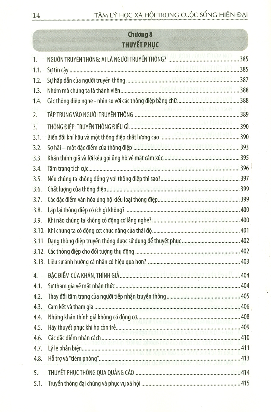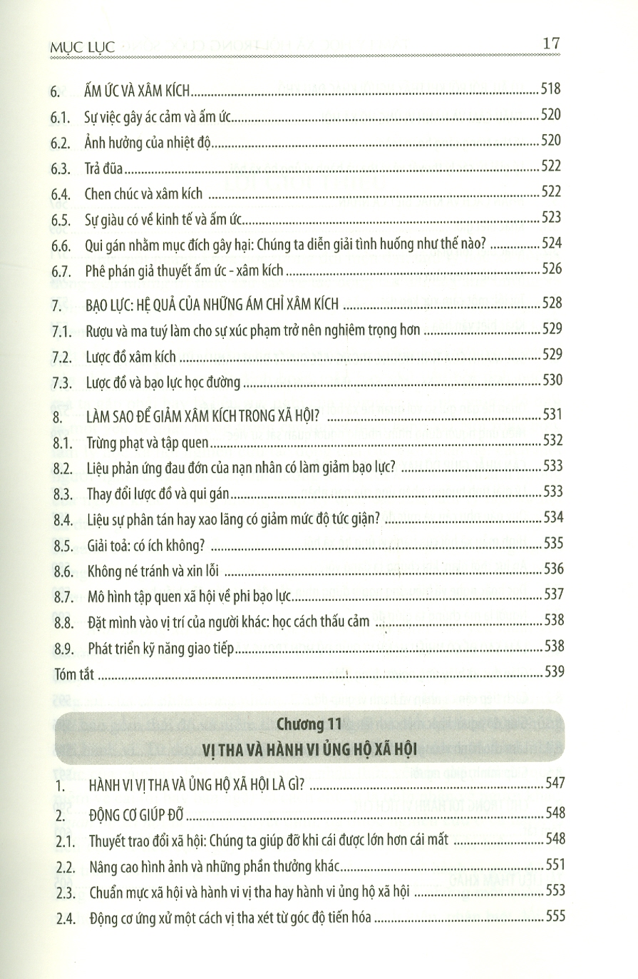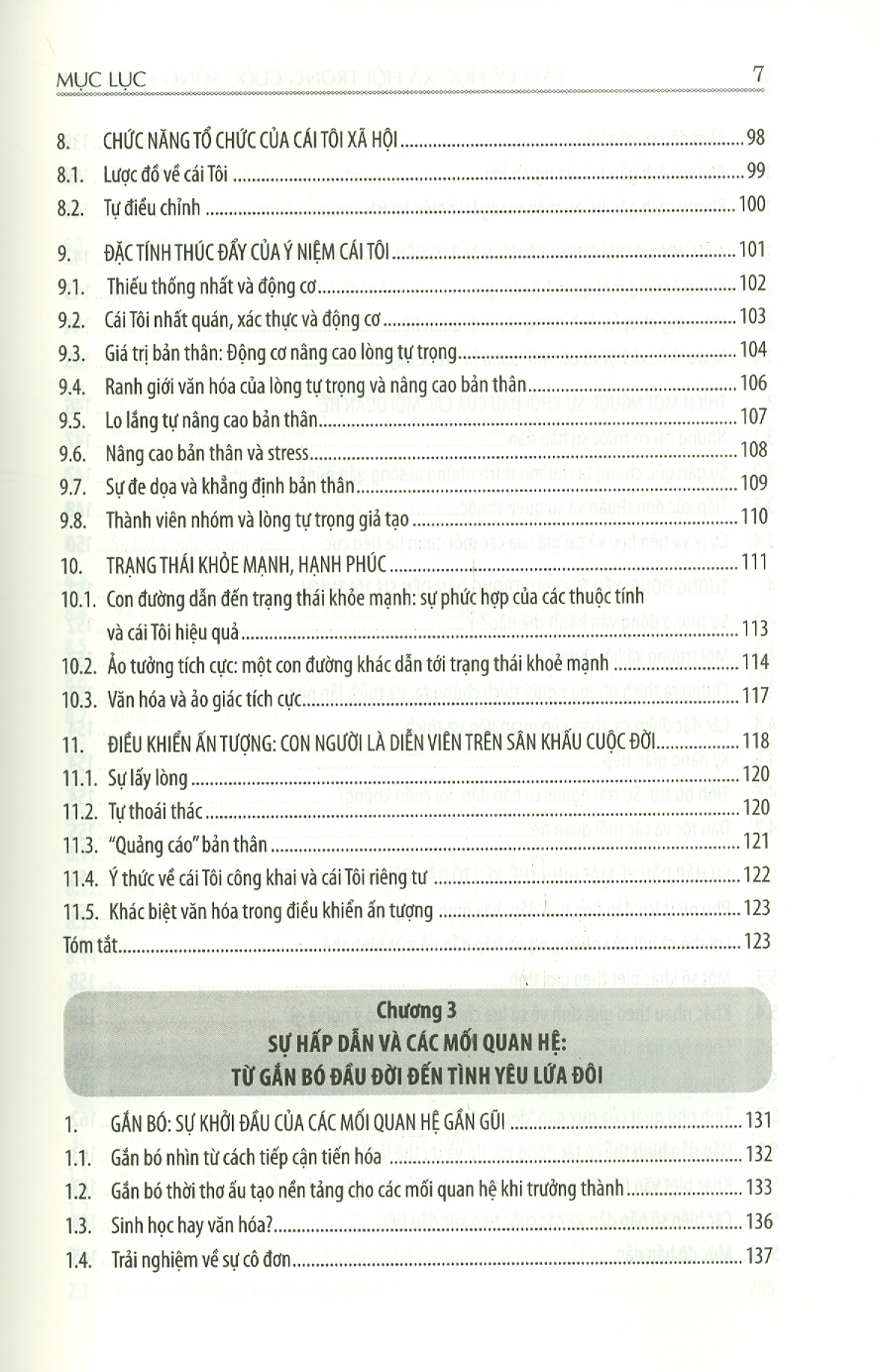 Chương 1: chuyên ngành tâm lý học xã hội Chương 2: Cái tôi nhìn từ góc độ văn hóa và xã hội Chương 3: Sự hấp dẫn và các mối quan hệ: từ gắn bó đầu đợi đến tình yêu lưá đôi Chương 4: Nhận thức xã hội: Chúng ta nghĩ về cuộc sống xã hội như thế nào Chương 5: Thái độ và hành vi Chương 6: Ảnh hưởng nhóm Chương 7: Quá trình ảnh hưởng xã hội: A dua, tuân thủ và phục tùng Chương 8: Thuyêt phục Chương 9: Hành vi liên nhóm thù địch: Định kiến, định khuôn và thù địch Chương 10: Xâm kích: sợ chỉ xuyên suốt nhân loại Chương 11: Vị tha và hành vi ủng hộ xã hội