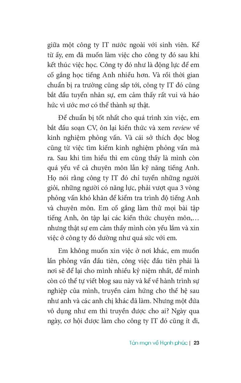 Tôi đã đọc nhiều sách viết về hạnh phúc, về giá trị sống và tư duy tích cực, về tâm linh… của các bậc thầy. Tôi nghĩ là mình cũng đã hiểu và tích lũy được tư duy cho hành trình tìm đến sự an lạc và có thể chia sẻ với mọi người. Nhưng những tản văn ngắn về hạnh phúc này cho tôi thấy có những góc nhìn, những cảm nhận về hạnh phúc thật gần gũi và giản đơn mà tôi cứ nghĩ đâu xa.