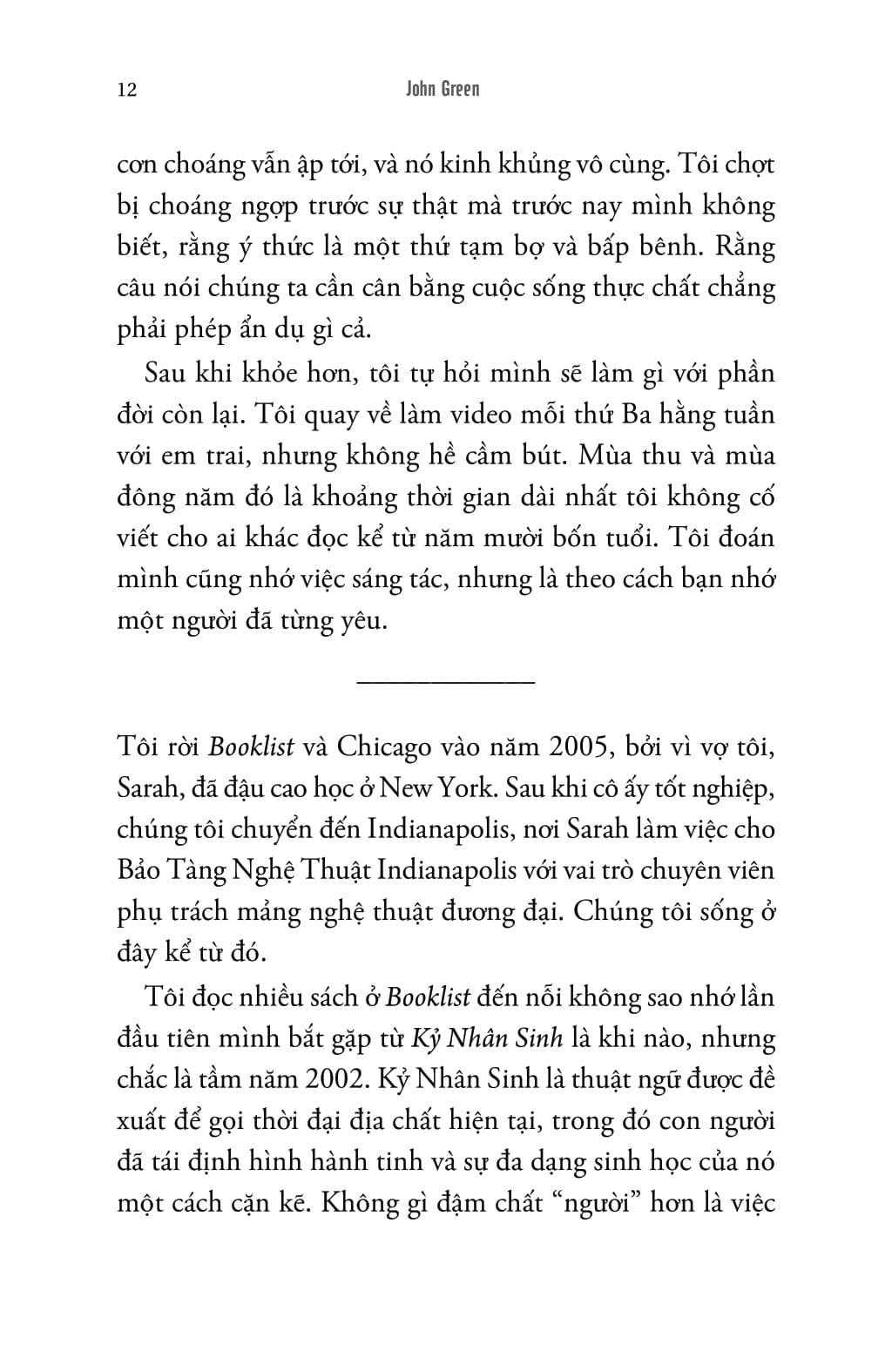 Kỷ nhân sinh là thời đại địa chất hiện tại, khi con người đang định hình một cách sâu sắc diện mạo Trái Đất và sự đa dạng sinh học của nó. Thông qua tuyển tập các bài viết được chuyển thể và mở rộng từ podcast của chính m.ình, nhà văn ăn khách John Green đã đánh giá các khía cạnh khác nhau của Trái Đất do con người kiến tạo theo thang điểm năm sao—từ bàn phím QWERTY, khung cảnh hoàng hôn rực rỡ đến bầy ngỗng Canada và Chim cánh cụt Madagascar.