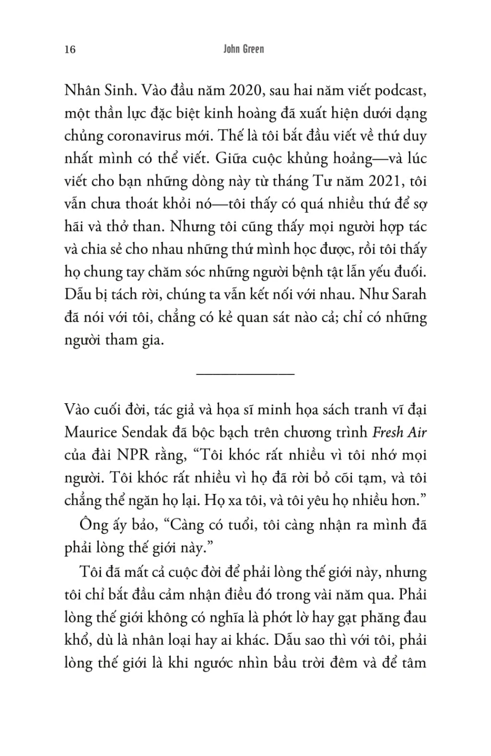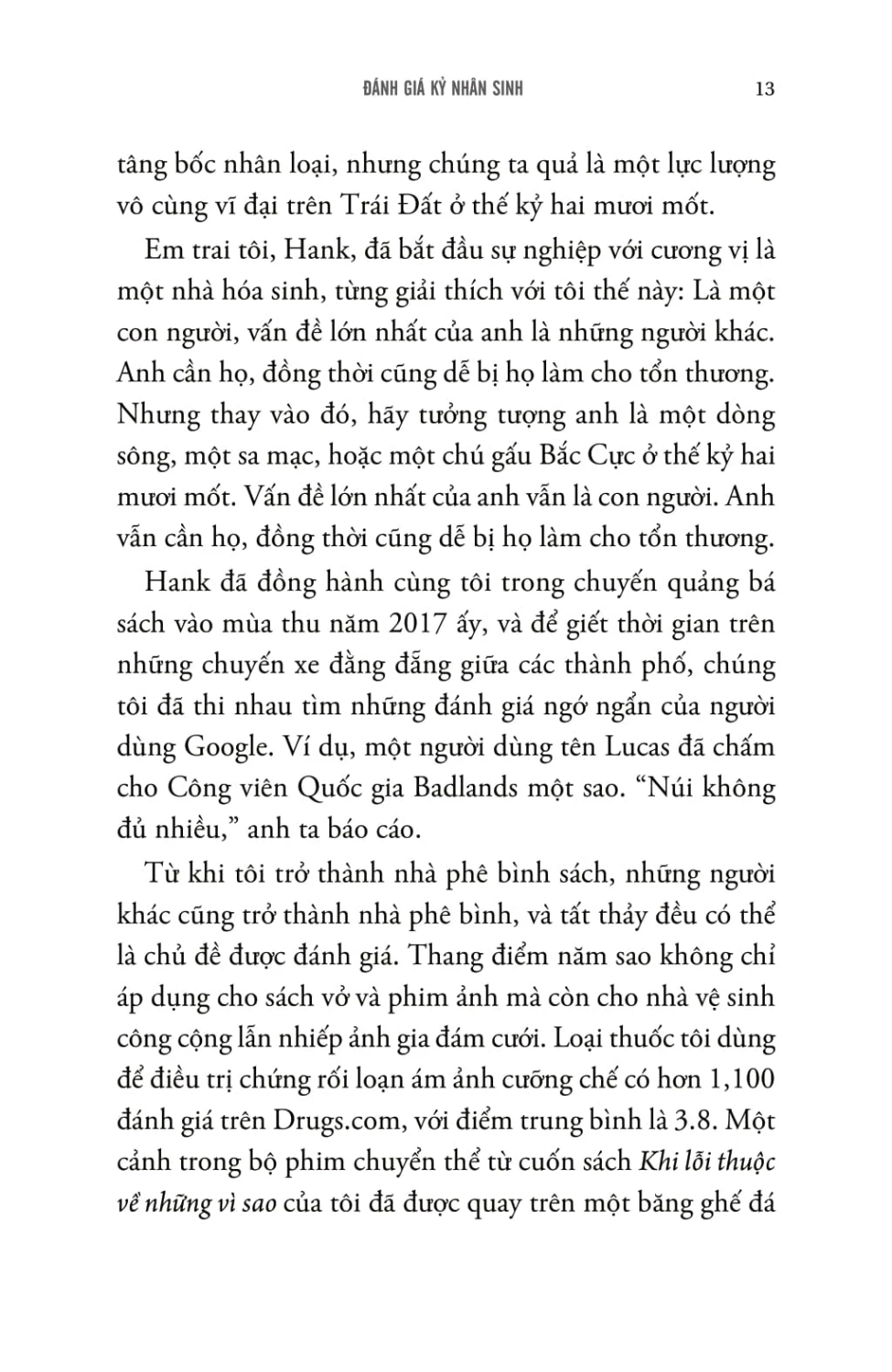 Mua tại TiktokTản Mạn Về Thế Giới - Đánh Giá Kỷ Nhân Sinh TRONG KỶ NHÂN SINH, CHẲNG CÓ KẺ ĐỨNG NGOÀI THỜ Ơ QUAN SÁT. MÀ TẤT CẢ ĐỀU CÙNG THAM GIA. Kỷ nhân sinh là thời đại địa chất hiện tại, khi con người đang định hình một cách sâu sắc diện mạo Trái Đất và sự đa dạng sinh học của nó. Thông qua tuyển tập các bài viết được chuyển thể và mở rộng từ podcast của chính mình, nhà văn ăn khách John Green đã đánh giá các khía cạnh khác nhau của Trái Đất do con người kiến tạo theo thang điểm năm sao—từ bàn phím QWERTY, khung cảnh hoàng hôn rực rỡ đến bầy ngỗng Canada và Chim cánh cụt Madagascar. Hài hước, tréo ngoe và giàu hình ảnh, các bài viết đã phác họa nên những nghịch lý của nhân loại đương đại. Sở hữu nguồn sức mạnh to lớn, nhưng con người cũng thật mềm yếu; nghịch lý càng trở nên rõ nét hơn khi loài người phải đối mặt với đại dịch toàn cầu vừa chia cắt lại cũng vừa gắn kết chúng ta với nhau. Các bài viết trong "Đánh giá kỷ nhân sinh" một lần nữa cho thấy tài kể chuyện hiếm có của John Green. Tác phẩm là cuộc hành trình khám phá đầy cảm hứng về những con đường mà chúng ta đã khai mở, đồng thời là một lời tụng ca chân thành về tình yêu dành cho thế giới.