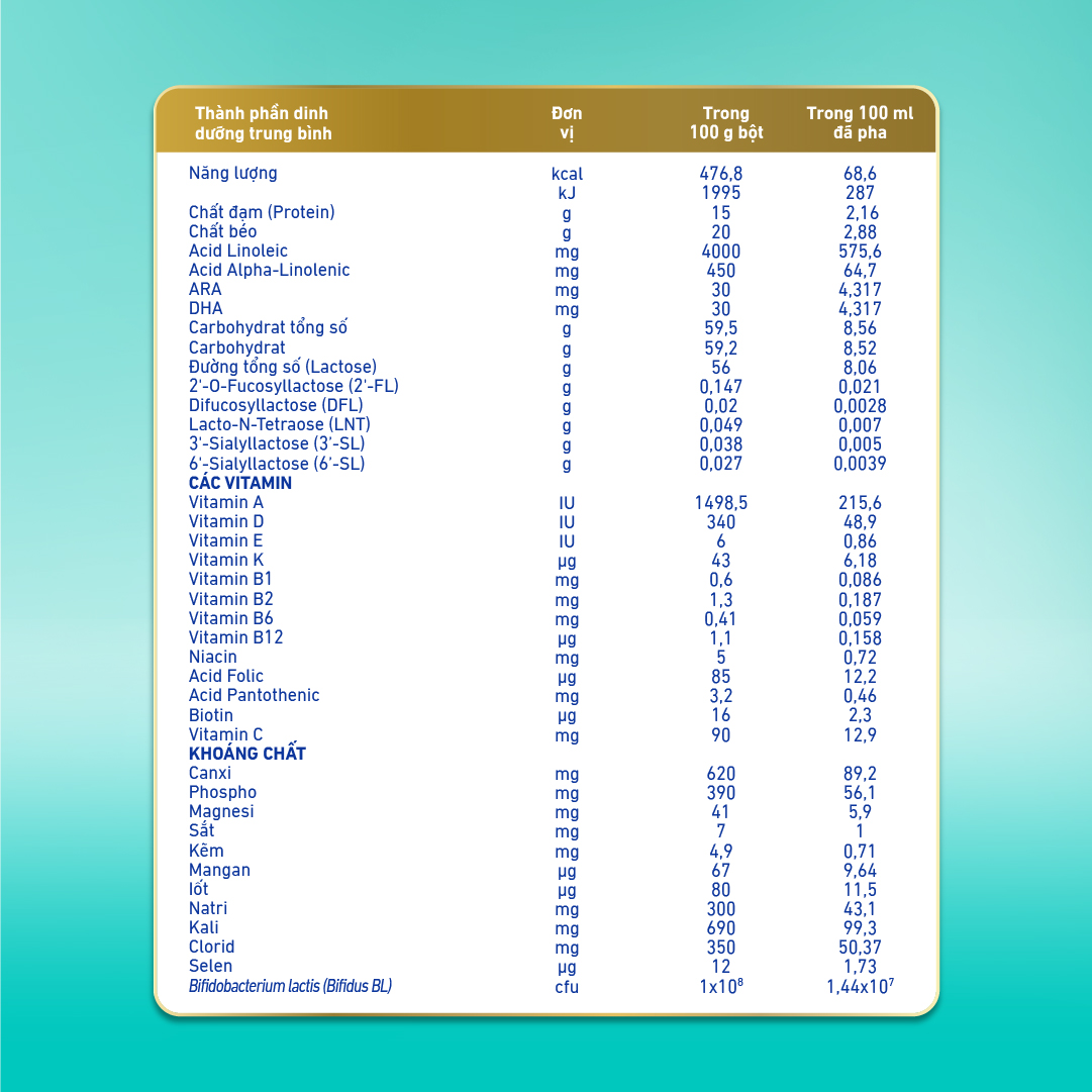 - Các dưỡng chất thiết yếu khác (DHA, ARA, Canxi & Vitamin D): hỗ trợ tăng trưởng chiều cao & phát triển trí não. Thành phần dinh dưỡng SỮA tách kem (MILK Skimmed), LACTOSE (Từ SỮA-From MILK), ĐẠM chất lượng OPTIPRO(ĐẠM WHEY, ĐẠM CASEIN từ SỮA-WHEY, CASEIN PROTEIN from MILK), Dầu hướng dương giàu Oleic, Dầu ĐẬU NÀNH (SOYA bean oil), Dầu dừa, Tricalci citrat, Trinatri citrat, Maltodextrin, Dikali hydro phosphat, Chất nhũ hóa Lecithin ĐẬU NÀNH (SOYA lecithin), 2’-Fucosyllactose (2’-FL), Chất nhũ hóa Mono và diglycerid của các acid béo, Natri ascorbat (Vitamin C), Dầu vi tảo biển giàu DHA, Dầu nấm giàu ARA, Lacto-N-Tetraose (LNT), 3'-Sialyllactose (3’-SL), Sắt (II) Sulphat, Difucosyllactose (DFL), 6'-Sialyllactose (6’-SL), Kẽm sulfat, DL-alpha-tocopheryl acetat (Vitamin E), Hương liệu tự nhiên vanillin, Nicotinamid, Chất điều chỉnh độ acid Acid citric, Bifidobacterium lactis (Bifidus BL), D-pantothenat calci (Vitamin B5), Chất chống oxy hóa Ascorbyl palmitat, Đồng sulfat, Retinyl acetat (Vitamin A), Thiamin mononitrat (Vitamin B1), Pyridoxin hydroclorid (Vitamin B6), Riboflavin (Vitamin B2), Chất chống oxy hóa Tocopherol concentrat (dạng hỗn hợp), Mangan sulfat, Axit folic, Kali iodid, Phytomenadion (Vitamin K1), Natri selenat, D-biotin (Vitamin B7), Cholecalciferol (Vitamin D3), Cyanocobalamin (Vitamin B12). () có chứa LACTOSE (contain LACTOSE). Hướng dẫn sử dụng Cách pha chế: