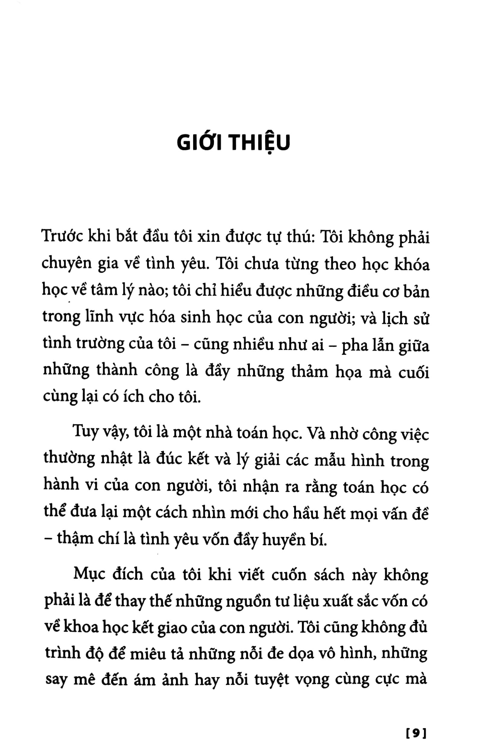 Nếu bạn nghĩ tình yêu và toán học vốn dĩ chẳng liên quan tới nhau cũng không sao. Cảm xúc của con người, không như những phương trình toán học, không thể có quy tắc hay được dạy dỗ, và những rộn ràng tinh tế của sự lãng mạn không hề dễ định nghĩa. Nhưng điều đó không có nghĩa toán học không thể đóng góp gì vào góc nhìn về tình yêu. Bởi vì rốt cuộc, toán học là ngành nghiên cứu về các mô hình, dạng thức, khám phá mọi vấn đề từ quy luật của vũ trụ đến hoạt động của các hạt hạ phân tử. Và thành thực mà xem xét thì trong số đó, không có gì là có quy tắc, trật tự hay dễ dàng dự đoán.