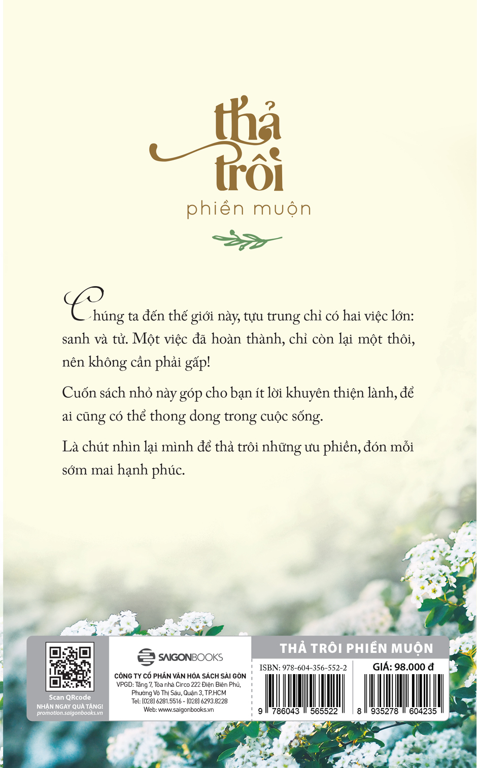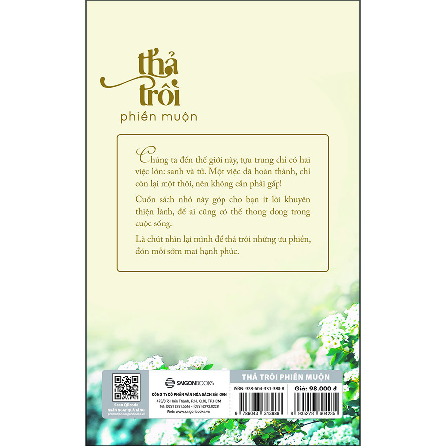 Cuốn sách này gồm phần lớn các bài tự dịch mà tác giả đã tổng hợp được trong những năm qua, đồng thời cũng là nơi tác giả trải lòng mình để mang đến những câu chữ đầy tính nhân văn về duyên phận cuộc đời và sự hạnh phúc của nhân sinh. Với Thả trôi phiền muộn, những câu chuyện đã được kể, muộn phiền theo đó cũng bay đi, biết yêu thương thân tâm mới sống được trọn vẹn.