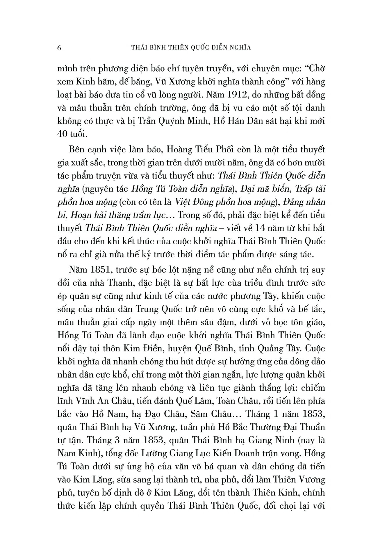 Qua 54 hồi của tiểu thuyết Thái Bình Thiên Quốc diễn nghĩa viết theo lối chương hồi cổ điển, Hoàng Tiểu Phối đã dẫn dắt người đọc lần lượt đi theo từng bước phát triển 14 năm của phong trào Thái Bình Thiên Quốc (1851 - 1864), qua từng trận đánh oanh liệt đẫm máu, với những con số thương vong ở mỗi trận chiến khiến độc giả phải kinh tâm động phách. Cùng với đó, mỗi nhân vật với tính cách, số phận khác nhau cũng được ông mô tả và kể lại một cách sống động và đầy màu sắc. Là một người sống cách chưa xa thời gian mà cuộc khởi nghĩa nổ ra, lại được gặp gỡ hỏi han những người trực tiếp tham gia phong trào ấy, rõ ràng Hoàng Tiểu Phối cho chúng ta thấy được độ tin cậy và chính xác nhất định của câu chuyện Thái Bình Thiên Quốc.