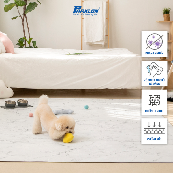 Mua tại TiktokThảm Trẻ Em Hàng Đầu Thế Giới Nhập Khẩu Chính Hãng Hàn Quốc Parklon Thương hiệu: Parklon Xuất xứ: Hàn Quốc Chất liệu: Nhựa PVC Họa tiết: Hoa Văn Vân Đá Hoa Cương Trắng Kích thước: 210cm x 140cm x 0.55cm Độ bền: 10 năm Sau thời gian tung tăng, bé yêu dễ dàng xếp gọn chiếc thảm và cất đi. Trọng lượng thảm chỉ 200g vô cùng nhẹ nhàng. Bề mặt của thảm chống trơn trượt, không bám bẩn và hoàn toàn không thấm nước nên có thể dễ dàng làm sạch với khăn ướt. Giữ không gian sạch sẽ và an toàn cho các bé. Lỡ tung tăng quá đà, ngã cũng không sao. Độ dày của thảm lên đến 1,2 cm, độ ma sát cao và cực kỳ êm ái. Bảo vệ trẻ khỏi những tổn thương do té ngã. Ngoài ra, nhờ độ êm ái, thảm làm giảm 50% tiếng ồn từ các tác động lên mặt sàn. Giúp các bé có thể vui chơi thỏa thích. THẢM TRẺ EM HÀNG ĐẦU THẾ GIỚI CHÍNH HÃNG PARKLON: Bảo vệ con bạn khỏi sàn nhà cứng khi các bé tập bò, tập đứng hay tập đi. Thảm trẻ em Parklon được thiết kế đặc biệt để hấp thụ tác động và mang lại sự thoải mái hàng giờ cho các bé. ★ Chất liệu cao cấp được nhập khẩu từ Đức, kết hợp với công nghệ tiên tiến nhất của Parklon để tạo nên những chiếc thảm trẻ em hoàn hảo nhất. ★ Công nghệ chống sốc, chống va đập và giảm tiếng ồn được cải tiến giúp trẻ thoải mái vui chơi. ★ Thiết kế 2 mặt với hoa văn đặc biệt chống trơn trượt và công nghệ bo góc đặc biệt không gây nguy hiểm cho bé. ★ Công nghệ Nano kháng khuẩn quanh năm, không gây dị ứng, an toàn ngay cả với làn da của trẻ sơ sinh. ★ Khả năng chống nước 100% và dễ dàng vệ sinh, chỉ cần lau sạch vết bẩn bằng khăn. ★ Bề mặt thảm mềm mại, êm ái kết hợp cùng chất liệu đặc biệt giúp giữ ấm vào mùa đông, không nóng vào mùa hè. ★ Chất liệu thân thiện với môi trường, không chứa các chất độc hại và kim loại nặng. ★ Đạt chứng nhận an toàn từ tổ chức toàn cầu: KC, SGS, ISO 9001, An toàn Châu Âu EN71