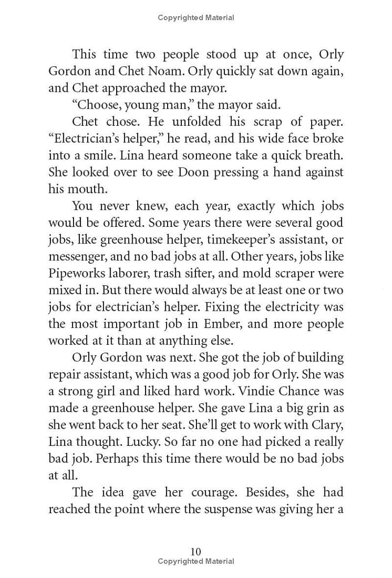 A modern-day classic. This highly acclaimed adventure series about two friends desperate to save their doomed city has captivated kids and teachers alike for almost fifteen years and has sold over 3.5 MILLION copies! The city of Ember was built as a last refuge for the human race. Two hundred years later, the great lamps that light the city are beginning to flicker. When Lina finds part of an ancient message, she's sure it holds a secret that will save the city. She and her friend Doon must race to figure out the clues before the lights go out on Ember forever! Nominated to 28 State Award Lists! An American Library Association Notable Children's Book A New York Public Library 100 Titles for Reading and Sharing Selection A Kirkus Reviews Editors' Choice A Child Magazine Best Children's Book A Mark Twain Award Winner A William Allen White Children's Book Award Winner "A realistic post-apocalyptic world. DuPrau's book leaves Doon and Lina on the verge of undiscovered country and readers wanting more." --USA Today "An electric debut." --Publishers Weekly, Starred "While Ember is colorless and dark, the book itself is rich with description." --VOYA, Starred "A harrowing journey into the unknown, and cryptic messages for readers to decipher." --Kirkus Reviews, Starred