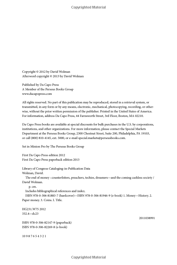 For ages, money has been represented by little metal disks and rectangular slips of paper. Yet the usefulness of physical money- to say nothing of its value- is coming under fire as never before. Intrigued by the distinct possibility that cash will soon disappear, author and Wired contributing editor David Wolman sets out to investigate the future of money, and how it will affect your with verve and wit, The End of Money explores an aspect of our daily lives so fundamental that we rarely stop to think about it. You'll never look at a dollar bill the same way again.
