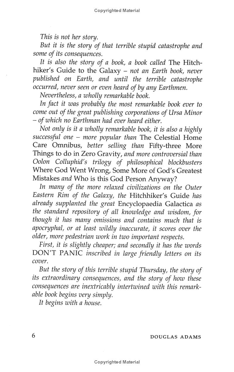 It's an ordinary Thursday lunchtime for Arthur Dent until his house gets demolished. The Earth follows shortly afterwards to make way for a new hyperspace express route, and his best friend has just announced that he's an alien. At this moment, they're hurtling through space with nothing but their towels and an innocuous-looking book inscribed, in large friendly letters, with the words: DON'T PANIC.