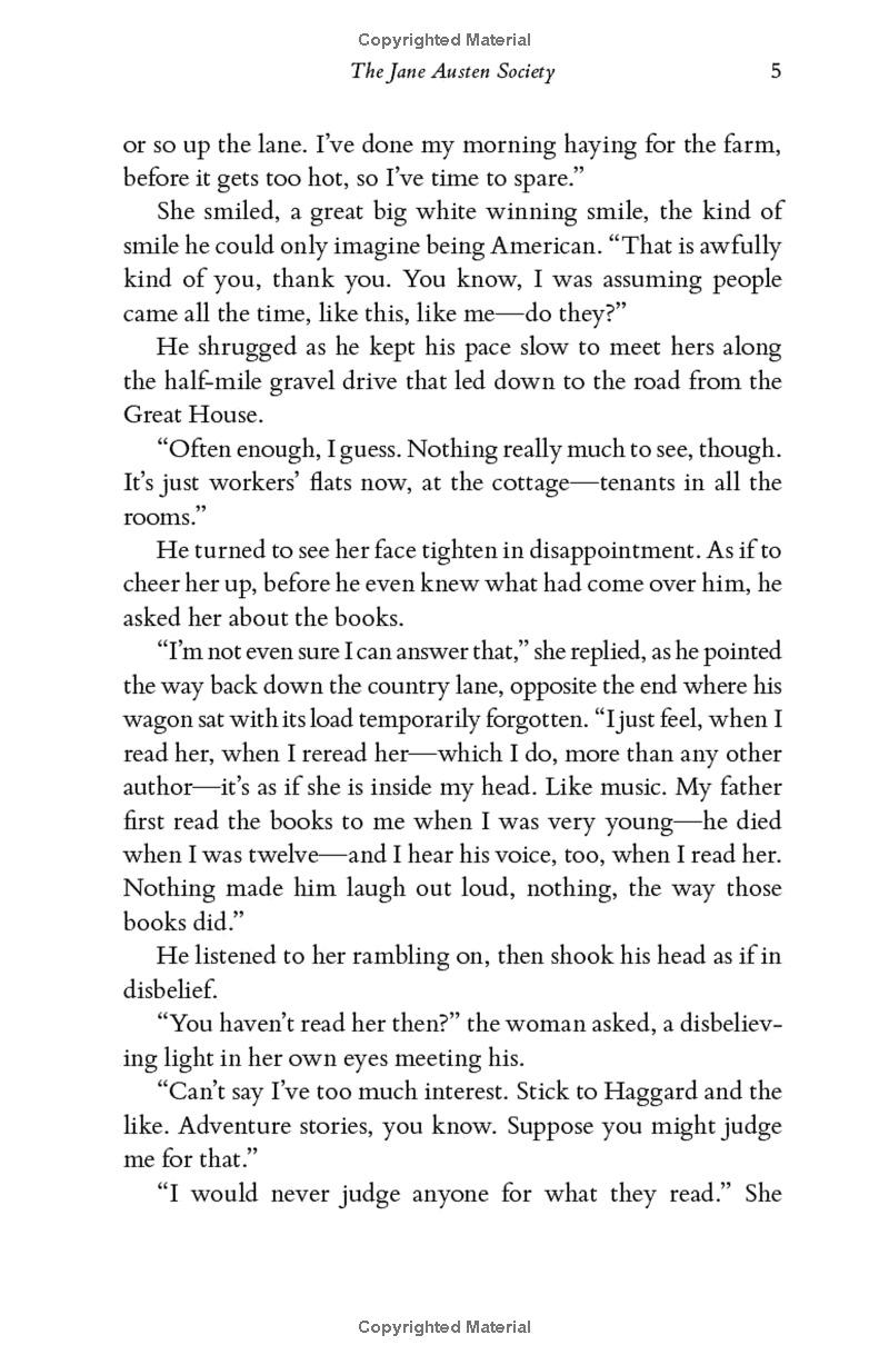 One hundred and fifty years ago, Chawton was the final home of Jane Austen, one of England's finest novelists. Now it's home to a few distant relatives and their diminishing estate. With the last bit of Austen's legacy threatened, a group of disparate individuals come together to preserve both Jane Austen's home and her legacy. These people-a laborer, a young widow, the local doctor, and a movie star, among others-could not be more different and yet they are united in their love for the works and words of Austen. As each of them endures their own quiet struggle with loss and trauma, some from the recent war, others from more distant tragedies, they rally together to create the Jane Austen Society.