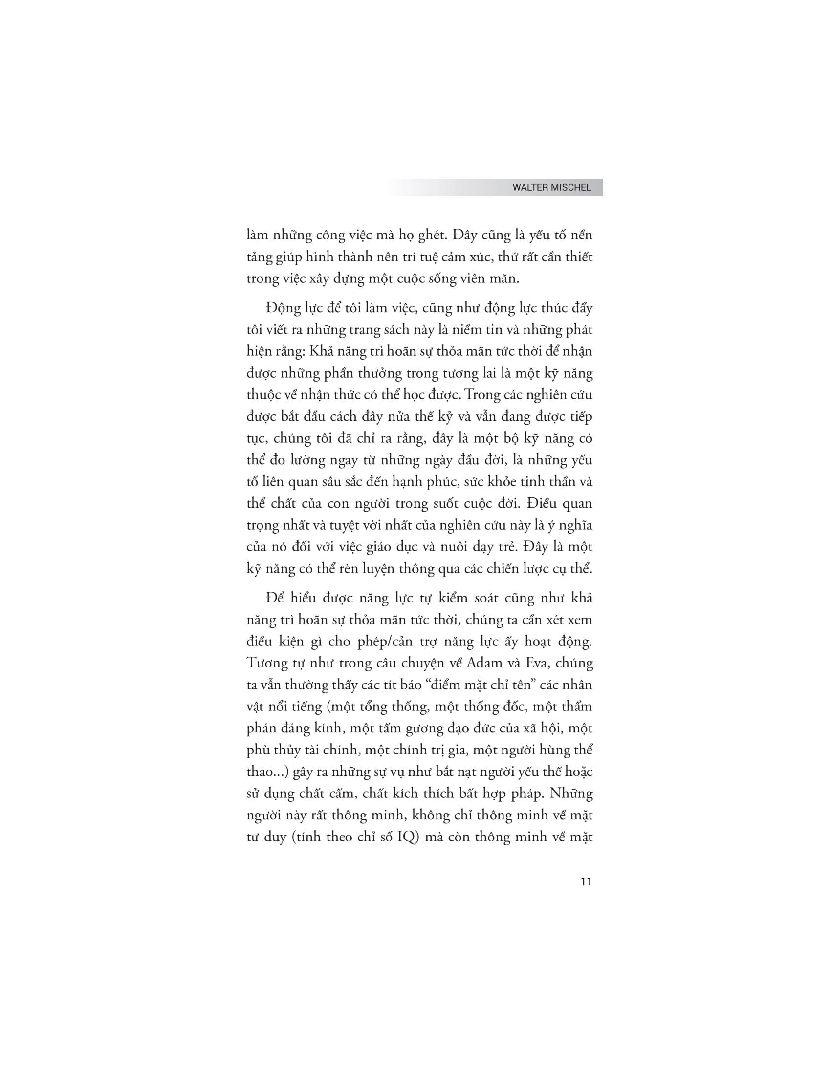 Tác giả Walter Mischel đi sâu vào phân tích các chiến lược và phương pháp giúp cải thiện khả năng tự kiểm soát, từ việc xây dựng ý chí mạnh mẽ đến việc áp dụng các chiến lược tinh thần để đối phó với cám dỗ và duy trì kiên nhẫn. Bên cạnh đó, tác giả cũng chỉ ra những yếu tố ảnh hưởng đến ý chí và sự kiểm soát bản thân, từ môi trường, cách giáo dục đến các yếu tố tâm lý cá nhân.