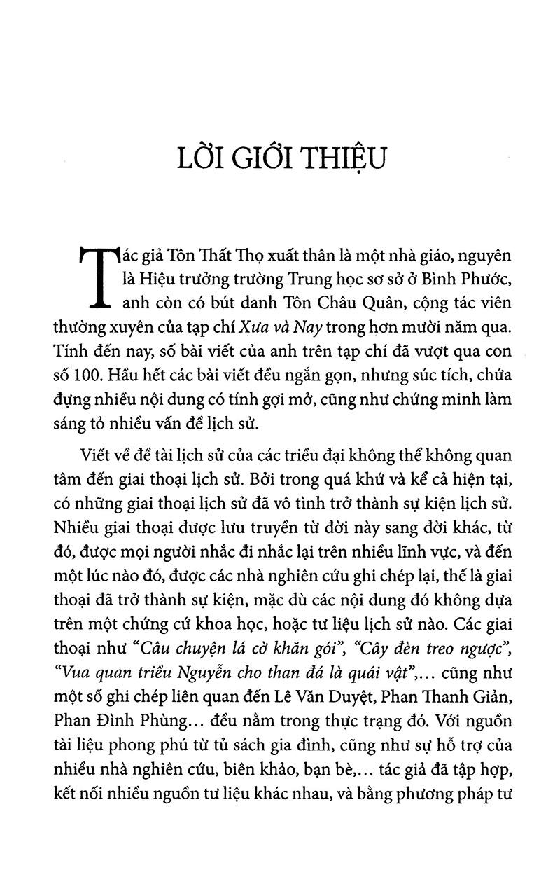 Tác giả Tôn Thất Thọ xuất thân là một nhà giáo, nguyên là Hiệu trưởng trường Trung học sơ sở ở Bình Phước, anh còn có bút danh Tôn Châu Quân, cộng tác viên th ường xuyên của tạp chí Xưa và Nay trong hơn mười năm qua. Tính đến nay, số bài viết của anh trên tạp chí đã vượt qua con số 100. Hầu hết các bài viết đều ngắn gọn, nhưng súc tích, chứa đựng nhiều nội dung có tính gợi mở, cũng như chứng minh làm sáng tỏ nhiều vấn đề lịch sử.