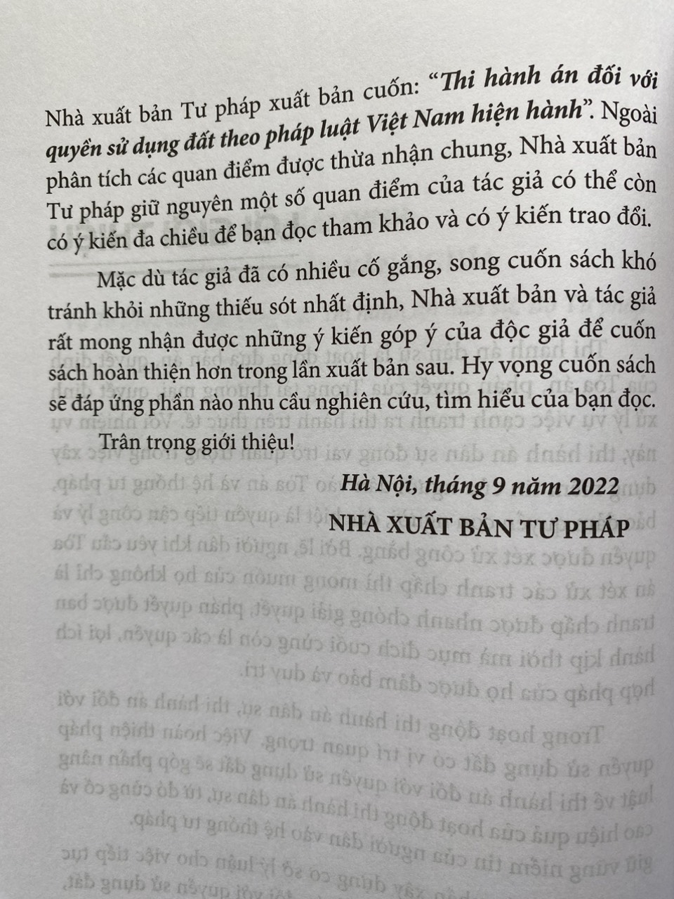 Thi hành án dân sự là hoạt động đưa bản án, quyết định của Tòa án, phán quyết của Trọng tài thương mại, quyết định xử lý vụ việc cạnh tranh ra thi hành trên thực tế. Với nhiệm vụ này, thi hành án dân sự đóng vai trò quan trọng trong việc xây dựng niềm tin của người dân vào Tòa án và hệ thống tư pháp, bảo đảm quyền con người, đặc biệt là quyền tiếp cận công lý và quyền được xét xử công bằng. Bởi lẽ, người dân khi yêu cầu Tòa án xét xử các tranh chấp thì mong muốn của họ không chỉ là tranh chấp được nhanh chóng giải quyết, phán quyết được ban hành kịp thời mà mục đích cuối cùng còn là các quyền, lợi ích hợp pháp của họ được bảo đảm và duy trì. Nhằm góp phần xây dựng cơ sở lý luận cho việc tiếp tục hoàn thiện pháp luật về thi hành án đối với quyền sử dụng đất, Nhà xuất bản Tư pháp xuất bản cuốn: "Thi hành án đối với quyền sử dụng đất theo pháp luật Việt Nam hiện hành". Ngoài phân tích các quan điểm được thừa nhận chung, Nhà xuất bản Tư pháp giữ nguyên một số quan điểm của tác giả có thể còn có ý kiến đa chiều để bạn đọc tham khảo và có ý kiến trao đổi.