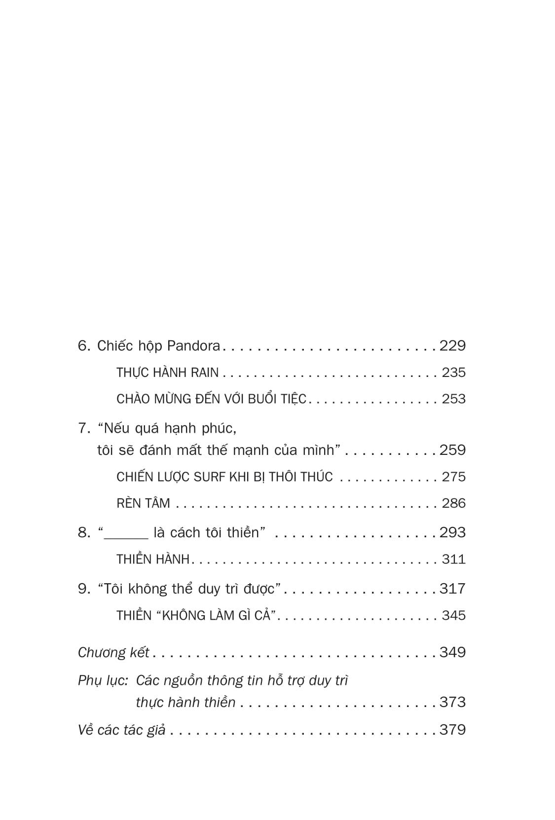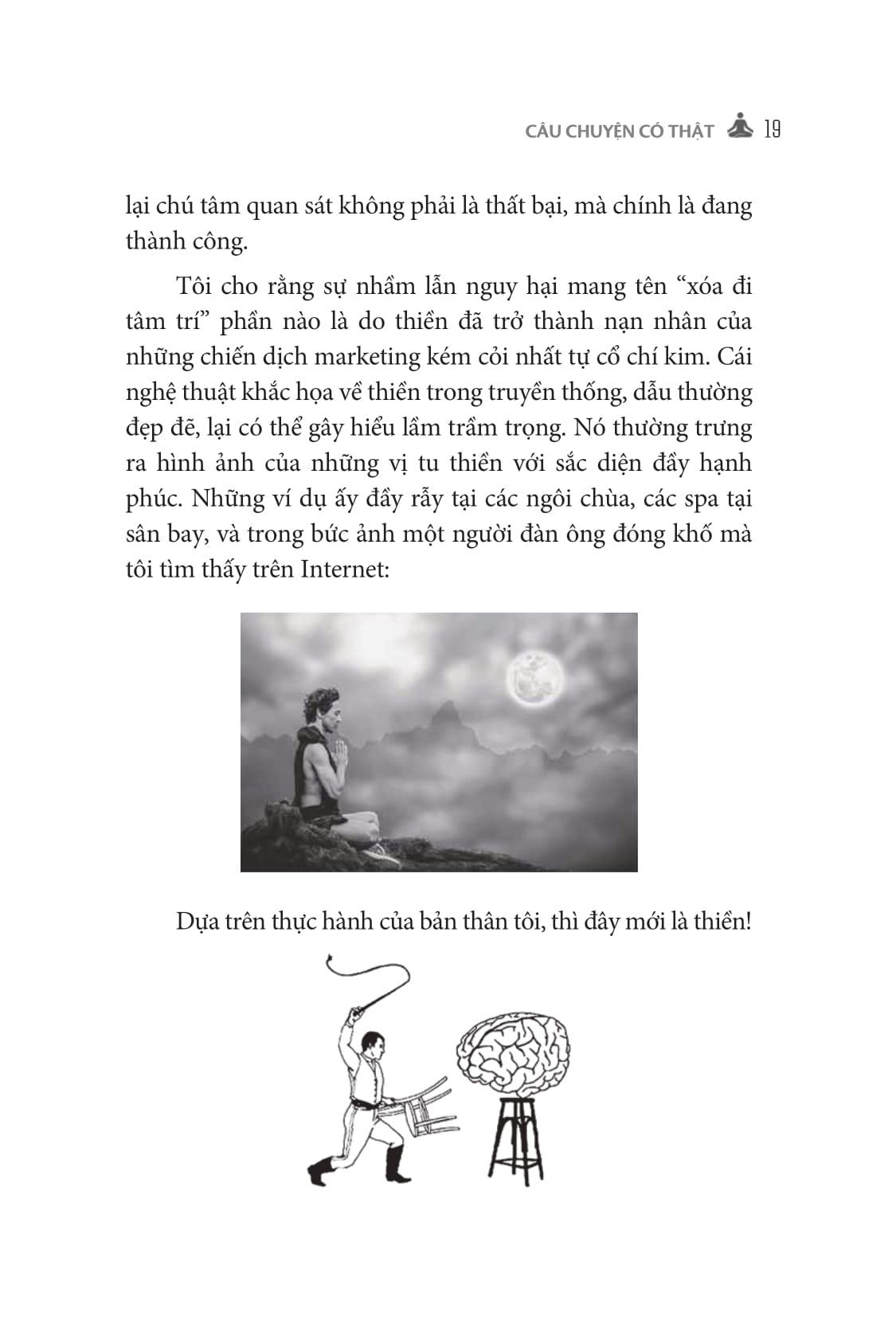 Việc bước ra khỏi những bộn bề thường ngày trong vòng vài phút và chỉ đơn thuần là hít thở mang đến cho tôi sự sáng suốt, ngay cả trong những ngày bận rộn và hối hả. Nó giúp ngắt ngang, dẫu ngắn ngủi, cái dòng chảy vô thức vô minh đang cuốn trôi tôi. Dù vậy, chuyện bình tâm cũng có chút khó khăn. Nhiều người bị thu hút vào thiền vì muốn thư giãn, nhưng rốt cuộc họ sẽ thất vọng vì tiếng nói bên trong liên tục lải nhải hoặc vì những cơn đau nhức, ngứa ngáy đâu đó thường xuyên xuất hiện. Dẫu thiền thường có tác dụng giúp bạn định tĩnh, nhưng tốt hơn hết là bạn đừng thiền với kỳ vọng nó sẽ thế này hay thế kia. Và, điều quan trọng là, kể cả khi có một thời thiền không mấy dễ chịu, tôi nhận thấy rằng tác dụng tổng thể khi thực hành thiền mỗi ngày, nói chung, chính là chỗ tâm trạng của tôi đã đỡ hơn hẳn.