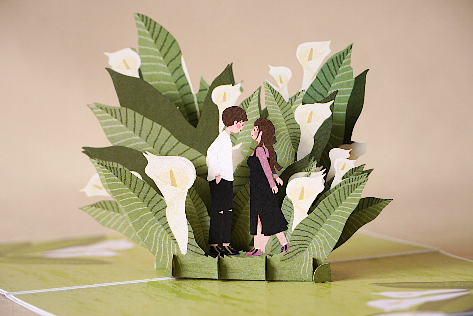 Thể hiện tình cảm ngọt ngào bằng thiệp 3D Pop Up cặp đôi giữa vườn hoa loa kèn. Khi mở thiệp, hình ảnh đôi tình nhân bật nổi giữa những bông loa kèn trắng tinh khôi và tán lá xanh mướt, mang đến khung cảnh lãng mạn và đầy ý nghĩa.