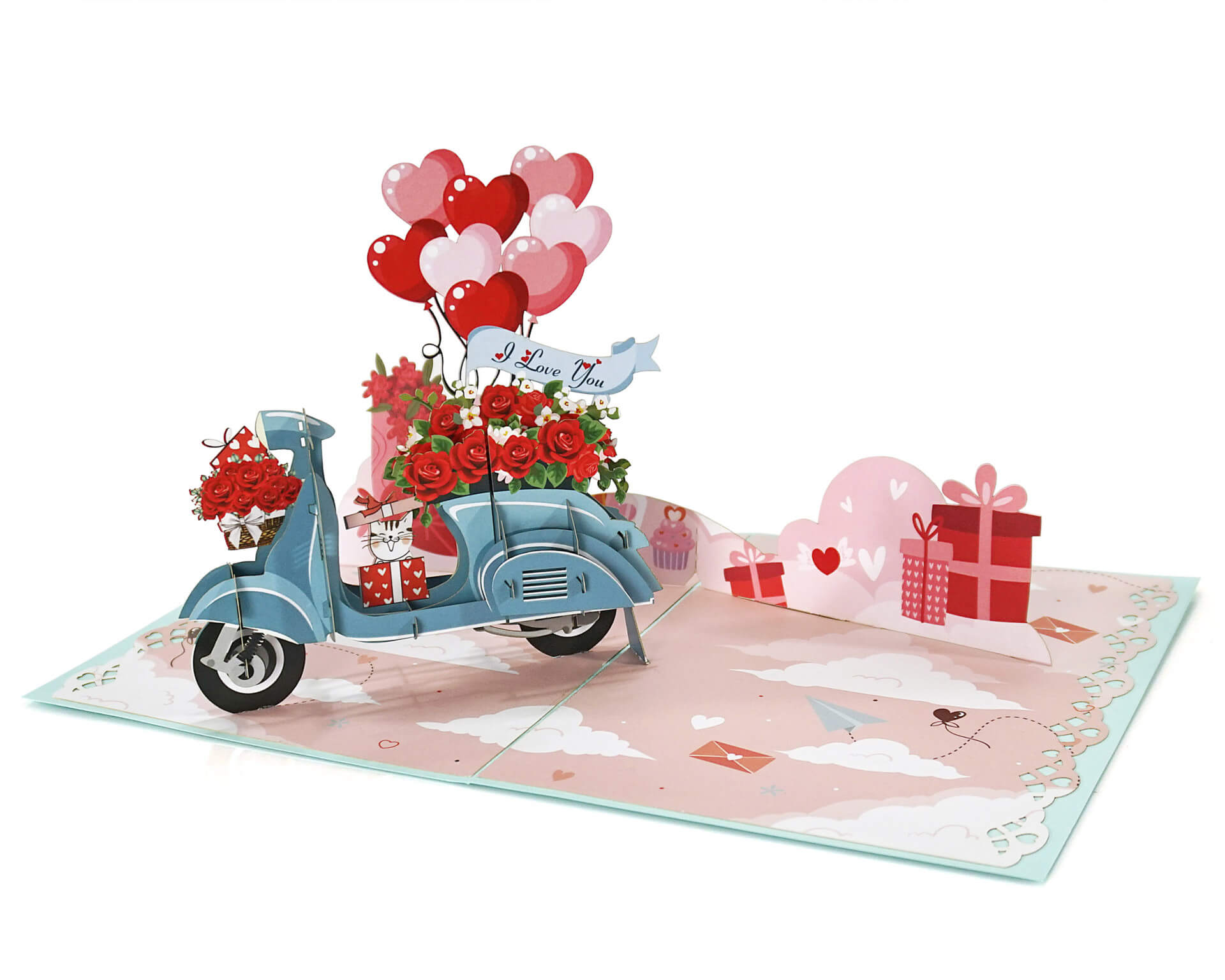 Thay lời muốn nói bằng thiệp 3D Pop Up xe máy tình yêu độc đáo. Khi mở ra, hình ảnh chiếc xe máy xanh bật nổi, chở đầy hoa hồng đỏ, bóng bay trái tim