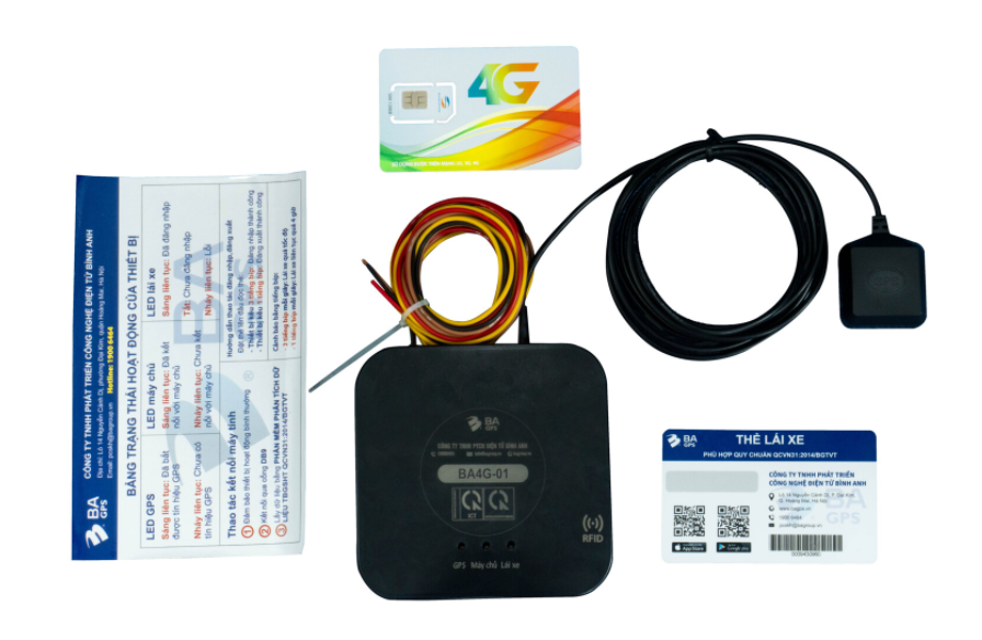 Bộ phụ kiện tiêu chuẩn: Thiết bị BA4G-01, angten GPS, thẻ lái xe, SIM điện thoại.