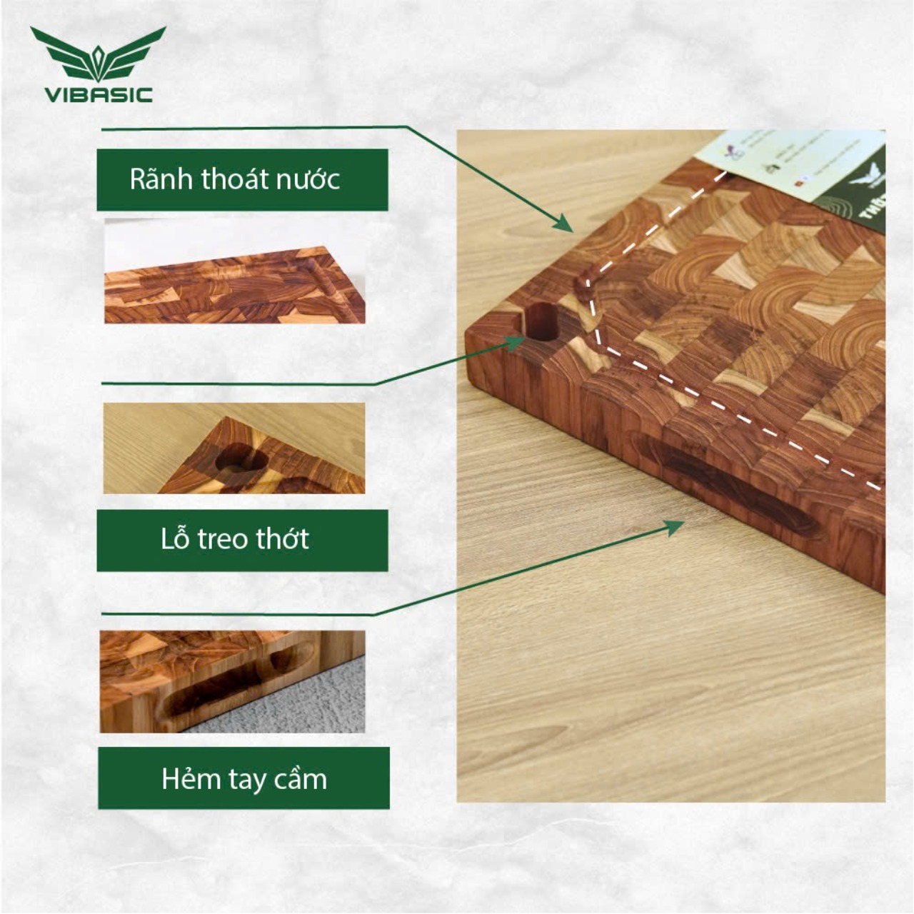 Thớt gỗ Teak Vibasic A80 phiên bản YÊU NƯỚC, ghép dựng block kích thước 350x250x27mm có lỗ treo, khắc logo 80 năm 2/9 dùng để cắt thái thực phẩm Đặc điểm nổi bật - Được