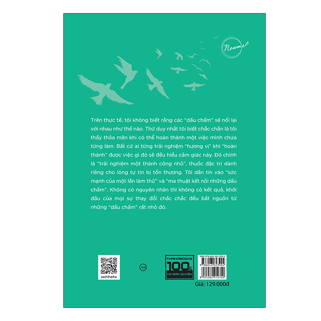[ThaiHaBooks] Trên thực tế, tôi không biết rằng các “dấu chấm” sẽ nối lại với nhau như thế nào. Thứ duy nhất tôi biết chắc chắn là tôi thấy thỏa mãn khi có thể hoàn thành một việc mình chưa từng làm. Bất cứ ai từng trải nghiệm “hương vị” khi “hoàn thành” được việc gì đó sẽ đều hiểu cảm giác này. Đó chính là “trải nghiệm một thành công nhỏ”, thuốc đặc trị dành riêng cho lòng tự tin bị tổn thương. Tôi dần tin vào “sức mạnh của một lần làm thử” và “ma thuật kết nối những dấu chấm”. Không có nguyên nhân thì không có kết quả, khởi đầu của mọi sự thay đổi chắc chắc đều bắt nguồn từ những “dấu chấm” rất nhỏ đó.