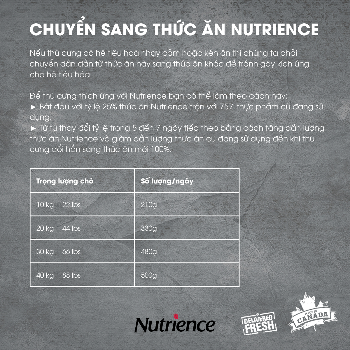 Điều quan trọng là phải chuyển dần dần chú chó cưng của bạn từ thức ăn này sang thức ăn khác để tránh gây kích ứng cho hệ tiêu hóa. Bắt đầu với tỷ lệ 25% thức ăn Nutrience trộn với 75% thực phẩm cũ đang sử dụng. Từ từ thay đổi tỷ lệ trong 5 đến 7 ngày tiếp theo bằng cách tăng dần lượng thức ăn Nutrience và giảm dần lượng thức ăn cũ đang sử dụng.